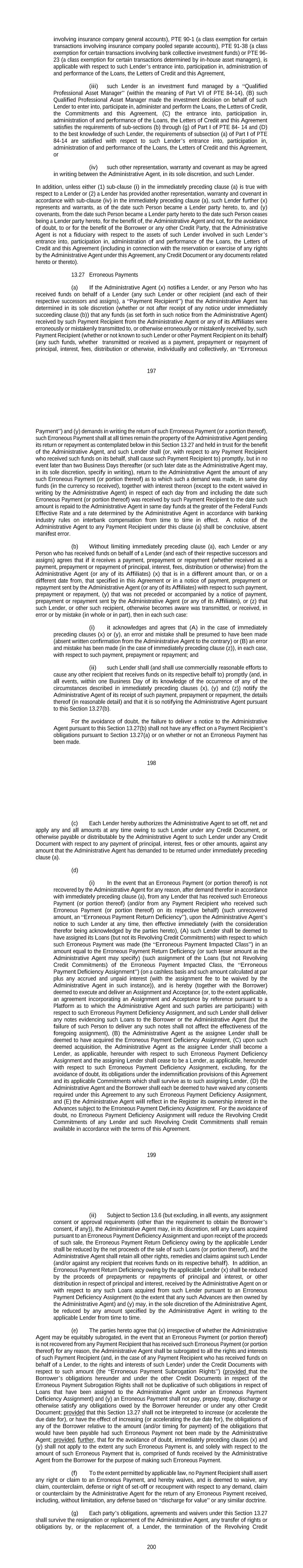 197 involving insurance company general accounts), PTE 90-1 (a class exemption for certain transactions involving insurance company pooled separate accounts), PTE 91-38 (a class exemption for certain transactions involving bank collective investment funds) or PTE 96- 23 (a class exemption for certain transactions determined by in-house asset managers), is applicable with respect to such Lender’s entrance into, participation in, administration of and performance of the Loans, the Letters of Credit and this Agreement, (iii) such Lender is an investment fund managed by a “Qualified Professional Asset Manager” (within the meaning of Part VI of PTE 84-14), (B) such Qualified Professional Asset Manager made the investment decision on behalf of such Lender to enter into, participate in, administer and perform the Loans, the Letters of Credit, the Commitments and this Agreement, (C) the entrance into, participation in, administration of and performance of the Loans, the Letters of Credit and this Agreement satisfies the requirements of sub-sections (b) through (g) of Part I of PTE 84- 14 and (D) to the best knowledge of such Lender, the requirements of subsection (a) of Part I of PTE 84-14 are satisfied with respect to such Lender’s entrance into, participation in, administration of and performance of the Loans, the Letters of Credit and this Agreement, or (iv) such other representation, warranty and covenant as may be agreed in writing between the Administrative Agent, in its sole discretion, and such Lender. In addition, unless either (1) sub-clause (i) in the immediately preceding clause (a) is true with respect to a Lender or (2) a Lender has provided another representation, warranty and covenant in accordance with sub-clause (iv) in the immediately preceding clause (a), such Lender further (x) represents and warrants, as of the date such Person became a Lender party hereto, to, and (y) covenants, from the date such Person became a Lender party hereto to the date such Person ceases being a Lender party hereto, for the benefit of, the Administrative Agent and not, for the avoidance of doubt, to or for the benefit of the Borrower or any other Credit Party, that the Administrative Agent is not a fiduciary with respect to the assets of such Lender involved in such Lender’s entrance into, participation in, administration of and performance of the Loans, the Letters of Credit and this Agreement (including in connection with the reservation or exercise of any rights by the Administrative Agent under this Agreement, any Credit Document or any documents related hereto or thereto). 13.27 Erroneous Payments (a) If the Administrative Agent (x) notifies a Lender, or any Person who has received funds on behalf of a Lender (any such Lender or other recipient (and each of their respective successors and assigns), a “Payment Recipient”) that the Administrative Agent has determined in its sole discretion (whether or not after receipt of any notice under immediately succeeding clause (b)) that any funds (as set forth in such notice from the Administrative Agent) received by such Payment Recipient from the Administrative Agent or any of its Affiliates were erroneously or mistakenly transmitted to, or otherwise erroneously or mistakenly received by, such Payment Recipient (whether or not known to such Lender or other Payment Recipient on its behalf) (any such funds, whether transmitted or received as a payment, prepayment or repayment of principal, interest, fees, distribution or otherwise, individually and collectively, an “Erroneous 198 Payment”) and (y) demands in writing the return of such Erroneous Payment (or a portion thereof), such Erroneous Payment shall at all times remain the property of the Administrative Agent pending its return or repayment as contemplated below in this Section 13.27 and held in trust for the benefit of the Administrative Agent, and such Lender shall (or, with respect to any Payment Recipient who received such funds on its behalf, shall cause such Payment Recipient to) promptly, but in no event later than two Business Days thereafter (or such later date as the Administrative Agent may, in its sole discretion, specify in writing), return to the Administrative Agent the amount of any such Erroneous Payment (or portion thereof) as to which such a demand was made, in same day funds (in the currency so received), together with interest thereon (except to the extent waived in writing by the Administrative Agent) in respect of each day from and including the date such Erroneous Payment (or portion thereof) was received by such Payment Recipient to the date such amount is repaid to the Administrative Agent in same day funds at the greater of the Federal Funds Effective Rate and a rate determined by the Administrative Agent in accordance with banking industry rules on interbank compensation from time to time in effect. A notice of the Administrative Agent to any Payment Recipient under this clause (a) shall be conclusive, absent manifest error. (b) Without limiting immediately preceding clause (a), each Lender or any Person who has received funds on behalf of a Lender (and each of their respective successors and assigns) agrees that if it receives a payment, prepayment or repayment (whether received as a payment, prepayment or repayment of principal, interest, fees, distribution or otherwise) from the Administrative Agent (or any of its Affiliates) (x) that is in a different amount than, or on a different date from, that specified in this Agreement or in a notice of payment, prepayment or repayment sent by the Administrative Agent (or any of its Affiliates) with respect to such payment, prepayment or repayment, (y) that was not preceded or accompanied by a notice of payment, prepayment or repayment sent by the Administrative Agent (or any of its Affiliates), or (z) that such Lender, or other such recipient, otherwise becomes aware was transmitted, or received, in error or 