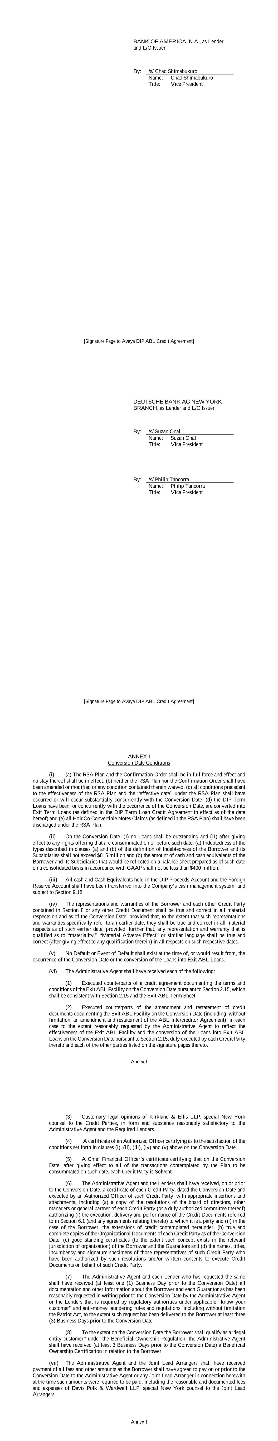 [Signature Page to Avaya DIP ABL Credit Agreement] BANK OF AMERICA, N.A., as Lender and L/C Issuer By: /s/ Chad Shimabukuro Name: Chad Shimabukuro Title: Vice President [Signature Page to Avaya DIP ABL Credit Agreement] DEUTSCHE BANK AG NEW YORK BRANCH, as Lender and L/C Issuer By: /s/ Suzan Onal Name: Suzan Onal Title: Vice President By: /s/ Philip Tancorra Name: Philip Tancorra Title: Vice President Annex I ANNEX I Conversion Date Conditions (i) (a) The RSA Plan and the Confirmation Order shall be in full force and effect and no stay thereof shall be in effect, (b) neither the RSA Plan nor the Confirmation Order shall have been amended or modified or any condition contained therein waived, (c) all conditions precedent to the effectiveness of the RSA Plan and the “effective date” under the RSA Plan shall have occurred or will occur substantially concurrently with the Conversion Date, (d) the DIP Term Loans have been, or concurrently with the occurrence of the Conversion Date, are converted into Exit Term Loans (as defined in the DIP Term Loan Credit Agreement in effect as of the date hereof) and (e) all HoldCo Convertible Notes Claims (as defined in the RSA Plan) shall have been discharged under the RSA Plan. (ii) On the Conversion Date, (I) no Loans shall be outstanding and (II) after giving effect to any rights offering that are consummated on or before such date, (a) Indebtedness of the types described in clauses (a) and (b) of the definition of Indebtedness of the Borrower and its Subsidiaries shall not exceed $815 million and (b) the amount of cash and cash equivalents of the Borrower and its Subsidiaries that would be reflected on a balance sheet prepared as of such date on a consolidated basis in accordance with GAAP shall not be less than $400 million. (iii) All cash and Cash Equivalents held in the DIP Proceeds Account and the Foreign Reserve Account shall have been transferred into the Company’s cash management system, and subject to Section 9.18. (iv) The representations and warranties of the Borrower and each other Credit Party contained in Section 8 or any other Credit Document shall be true and correct in all material respects on and as of the Conversion Date; provided that, to the extent that such representations and warranties specifically refer to an earlier date, they shall be true and correct in all material respects as of such earlier date; provided, further that, any representation and warranty that is qualified as to “materiality,” “Material Adverse Effect” or similar language shall be true and correct (after giving effect to any qualification therein) in all respects on such respective dates. (v) No Default or Event of Default shall exist at the time of, or would result from, the occurrence of the Conversion Date or the conversion of the Loans into Exit ABL Loans. (vi) The Administrative Agent shall have received each of the following: (1) Executed counterparts of a credit agreement documenting the terms and conditions of the Exit ABL Facility on the Conversion Date pursuant to Section 2.15, which shall be consistent with Section 2.15 and the Exit ABL Term Sheet. (2) Executed counterparts of the amendment and restatement of credit documents documenting the Exit ABL Facility on the Conversion Date (including, without limitation, an amendment and restatement of the ABL Intercreditor Agreement), in each case to the extent reasonably requested by the Administrative Agent to reflect the effectiveness of the Exit ABL Facility and the conversion of the Loans into Exit ABL Loans on the Conversion Date pursuant to Section 2.15, duly executed by each Credit Party thereto and each of the other parties listed on the signature pages thereto. Annex I (3) Customary legal opinions of Kirkland & Ellis LLP, special New York counsel to the Credit Parties, in form and substance reasonably satisfactory to the Administrative Agent and the Required Lenders. (4) A certificate of an Authorized Officer certifying as to the satisfaction of the conditions set forth in clauses (i), (ii), (iii), (iv) and (v) above on the Conversion Date. (5) A Chief Financial Officer’s certificate certifying that on the Conversion Date, after giving effect to all of the transactions contemplated by the Plan to be consummated on such date, each Credit Party is Solvent. (6) The Administrative Agent and the Lenders shall have received, on or prior to the Conversion Date, a certificate of each Credit Party, dated the Conversion Date and executed by an Authorized Officer of such Credit Party, with appropriate insertions and attachments, including (a) a copy of the resolutions of the board of directors, other managers or general partner of each Credit Party (or a duly authorized committee thereof) authorizing (i) the execution, delivery and performance of the Credit Documents referred to in Section 6.1 (and any agreements relating thereto) to which it is a party and (ii) in the case of the Borrower, the extensions of credit contemplated hereunder, (b) true and complete copies of the Organizational Documents of each Credit Party as of the Conversion Date, (c) good standing certificates (to the extent such concept exists in the relevant jurisdiction of organization) of the Borrower and the Guarantors and (d) the names, titles, incumbency and signature specimens of those representatives of such Credit Party who have been authorized by such resolutions and/or written consents to execute Credit Documents on behalf of such Credit Party. (7) The Administrative Agent and each Lender who has requested the same shall have received (at least one (1) Business Day prior to the Conversion Date) all documentation and other information about the Borrower and each Guarantor as has been reasonably requested in writing prior to the Conversion Date by the Administrative Agent or the Lenders that is required by regulatory authorities under applicable “know your customer” and anti-money laundering rules and regulation