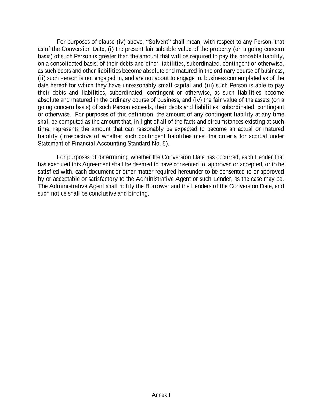 Annex I For purposes of clause (iv) above, “Solvent” shall mean, with respect to any Person, that as of the Conversion Date, (i) the present fair saleable value of the property (on a going concern basis) of such Person is greater than the amount that will be required to pay the probable liability, on a consolidated basis, of their debts and other liabilities, subordinated, contingent or otherwise, as such debts and other liabilities become absolute and matured in the ordinary course of business, (ii) such Person is not engaged in, and are not about to engage in, business contemplated as of the date hereof for which they have unreasonably small capital and (iii) such Person is able to pay their debts and liabilities, subordinated, contingent or otherwise, as such liabilities become absolute and matured in the ordinary course of business, and (iv) the fair value of the assets (on a going concern basis) of such Person exceeds, their debts and liabilities, subordinated, contingent or otherwise. For purposes of this definition, the amount of any contingent liability at any time shall be computed as the amount that, in light of all of the facts and circumstances existing at such time, represents the amount that can reasonably be expected to become an actual or matured liability (irrespective of whether such contingent liabilities meet the criteria for accrual under Statement of Financial Accounting Standard No. 5). For purposes of determining whether the Conversion Date has occurred, each Lender that has executed this Agreement shall be deemed to have consented to, approved or accepted, or to be satisfied with, each document or other matter required hereunder to be consented to or approved by or acceptable or satisfactory to the Administrative Agent or such Lender, as the case may be. The Administrative Agent shall notify the Borrower and the Lenders of the Conversion Date, and such notice shall be conclusive and binding.