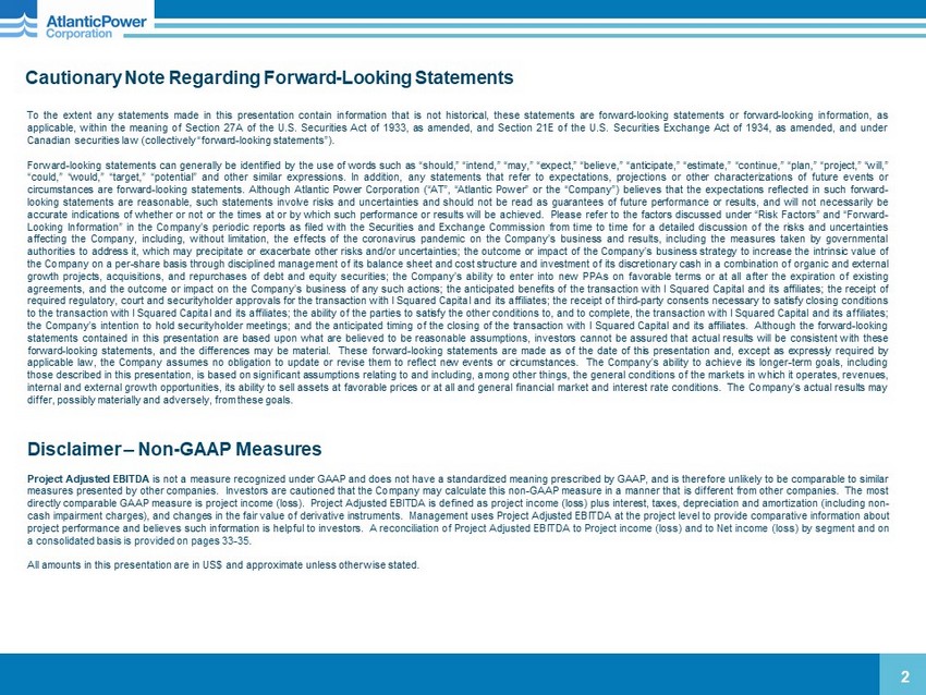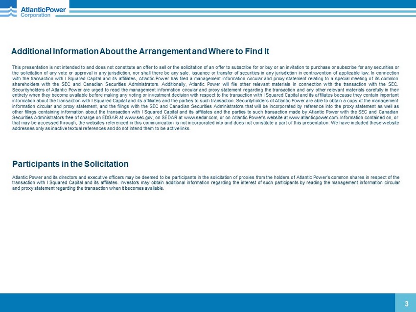 Cautionary Note Regarding Forward - Looking Statements 2 To the extent any statements made in this presentation contain information that is not historical, these statements are forward - looking statements or forward - looking information, as applicable, within the meaning of Section 27 A of the U . S . Securities Act of 1933 , as amended, and Section 21 E of the U . S . Securities Exchange Act of 1934 , as amended, and under Canadian securities law (collectively “forward - looking statements”) . Forward - looking statements can generally be identified by the use of words such as “should,” “intend,” “may,” “expect,” “believe,” “anticipate,” “estimate,” “continue,” “plan,” “project,” “will,” “could,” “would,” “target,” “potential” and other similar expressions . In addition, any statements that refer to expectations, projections or other characterizations of future events or circumstances are forward - looking statements . Although Atlantic Power Corporation (“AT”, “Atlantic Power” or the “Company”) believes that the expectations reflected in such forward - looking statements are reasonable, such statements involve risks and uncertainties and should not be read as guarantees of future performance or results, and will not necessarily be accurate indications of whether or not or the times at or by which such performance or results will be achieved . Please refer to the factors discussed under “Risk Factors” and “Forward - Looking Information” in the Company’s periodic reports as filed with the Securities and Exchange Commission from time to time for a detailed discussion of the risks and uncertainties affecting the Company, including, without limitation, the effects of the coronavirus pandemic on the Company’s business and results, including the measures taken by governmental authorities to address it, which may precipitate or exacerbate other risks and/or uncertainties ; the outcome or impact of the Company’s business strategy to increase the intrinsic value of the Company on a per - share basis through disciplined management of its balance sheet and cost structure and investment of its discretionary cash in a combination of organic and external growth projects, acquisitions, and repurchases of debt and equity securities ; the Company’s ability to enter into new PPAs on favorable terms or at all after the expiration of existing agreements, and the outcome or impact on the Company’s business of any such actions ; the anticipated benefits of the transaction with I Squared Capital and its affiliates ; the receipt of required regulatory, court and securityholder approvals for the transaction with I Squared Capital and its affiliates ; the receipt of third - party consents necessary to satisfy closing conditions to the transaction with I Squared Capital and its affiliates ; the ability of the parties to satisfy the other conditions to, and to complete, the transaction with I Squared Capital and its affiliates ; the Company’s intention to hold securityholder meetings ; and the anticipated timing of the closing of the transaction with I Squared Capital and its affiliates . Although the forward - looking statements contained in this presentation are based upon what are believed to be reasonable assumptions, investors cannot be assured that actual results will be consistent with these forward - looking statements, and the differences may be material . These forward - looking statements are made as of the date of this presentation and, except as expressly required by applicable law, the Company assumes no obligation to update or revise them to reflect new events or circumstances . The Company’s ability to achieve its longer - term goals, including those described in this presentation, is based on significant assumptions relating to and including, among other things, the general conditions of the markets in which it operates, revenues, internal and external growth opportunities, its ability to sell assets at favorable prices or at all and general financial market and interest rate conditions . The Company’s actual results may differ, possibly materially and adversely, from these goals . Disclaimer – Non - GAAP Measures Project Adjusted EBITDA is not a measure recognized under GAAP and does not have a standardized meaning prescribed by GAAP, and is therefore unlikely to be comparable to similar measures presented by other companies . Investors are cautioned that the Company may calculate this non - GAAP measure in a manner that is different from other companies . The most directly comparable GAAP measure is project income (loss) . Project Adjusted EBITDA is defined as project income (loss) plus interest, taxes, depreciation and amortization (including non - cash impairment charges), and changes in the fair value of derivative instruments . Management uses Project Adjusted EBITDA at the project level to provide comparative information about project performance and believes such information is helpful to investors . A reconciliation of Project Adjusted EBITDA to Project income (loss) and to Net income (loss) by segment and on a consolidated basis is provided on pages 33 - 35 . All amounts in this presentation are in US $ and approximate unless otherwise stated .