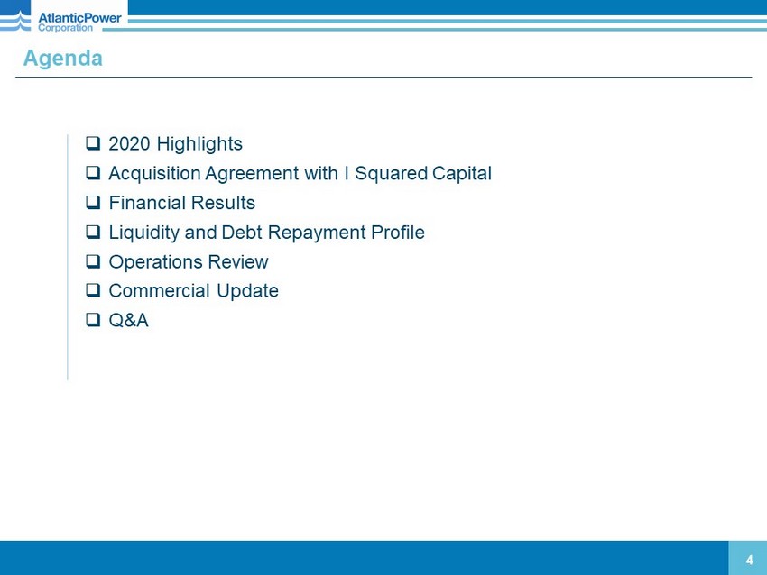 Additional Information About the Arrangement and Where to Find It 3 This presentation is not intended to and does not constitute an offer to sell or the solicitation of an offer to subscribe for or buy or an invitation to purchase or subscribe for any securities or the solicitation of any vote or approval in any jurisdiction, nor shall there be any sale, issuance or transfer of securities in any jurisdiction in contravention of applicable law . In connection with the transaction with I Squared Capital and its affiliates, Atlantic Power has filed a management information circular and proxy statement relating to a special meeting of its common shareholders with the SEC and Canadian Securities Administrators . Additionally, Atlantic Power will file other relevant materials in connection with the transaction with the SEC . Securityholders of Atlantic Power are urged to read the management information circular and proxy statement regarding the transaction and any other relevant materials carefully in their entirety when they become available before making any voting or investment decision with respect to the transaction with I Squared Capital and its affiliates because they contain important information about the transaction with I Squared Capital and its affiliates and the parties to such transaction . Securityholders of Atlantic Power are able to obtain a copy of the management information circular and proxy statement, and the filings with the SEC and Canadian Securities Administrators that will be incorporated by reference into the proxy statement as well as other filings containing information about the transaction with I Squared Capital and its affiliates and the parties to such transaction made by Atlantic Power with the SEC and Canadian Securities Administrators free of charge on EDGAR at www . sec . gov, on SEDAR at www . sedar . com, or on Atlantic Power’s website at www . atlanticpower . com . Information contained on, or that may be accessed through, the websites referenced in this communication is not incorporated into and does not constitute a part of this presentation . We have included these website addresses only as inactive textual references and do not intend them to be active links . Participants in the Solicitation Atlantic Power and its directors and executive officers may be deemed to be participants in the solicitation of proxies from the holders of Atlantic Power’s common shares in respect of the transaction with I Squared Capital and its affiliates . Investors may obtain additional information regarding the interest of such participants by reading the management information circular and proxy statement regarding the transaction when it becomes available .