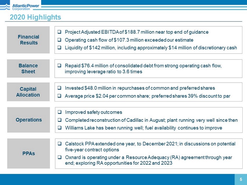 4 □ 2020 Highlights □ Acquisition Agreement with I Squared Capital □ Financial Results □ Liquidity and Debt Repayment Profile □ Operations Review □ Commercial Update □ Q&A Agenda