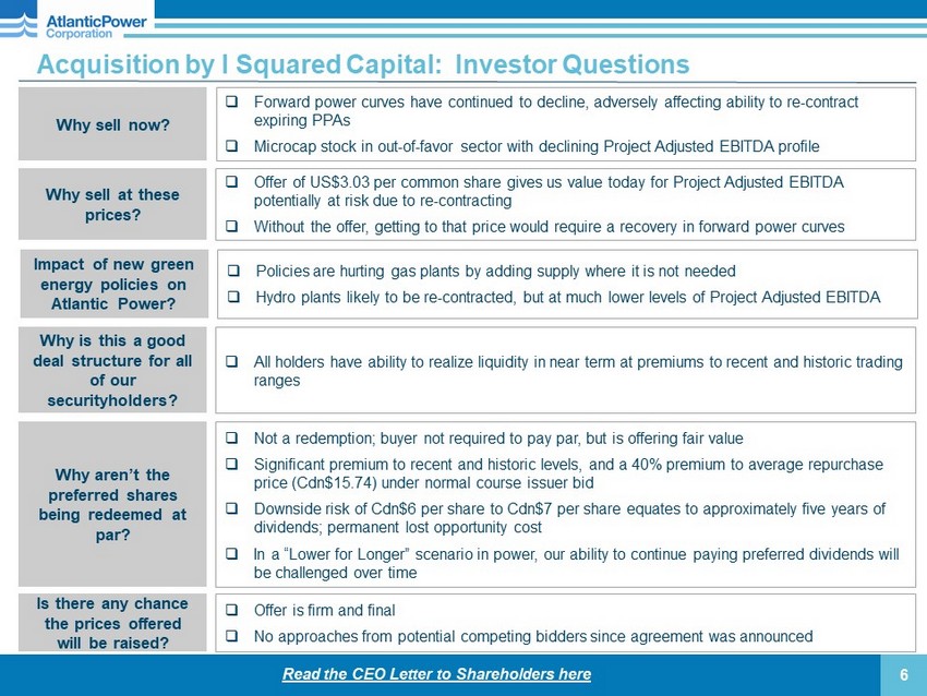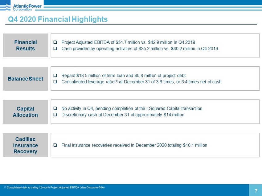 Acquisition by I Squared Capital: Investor Questions Why sell now? □ Forward power curves have continued to decline, adversely affecting ability to re - contract expiring PPAs □ Microcap stock in out - of - favor sector with declining Project Adjusted EBITDA profile Why sell at these prices? □ Offer of US$3.03 per common share gives us value today for Project Adjusted EBITDA potentially at risk due to re - contracting □ Without the offer, getting to that price would require a recovery in forward power curves Impact of new green energy policies on Atlantic Power? □ Policies are hurting gas plants by adding supply where it is not needed □ Hydro plants likely to be re - contracted, but at much lower levels of Project Adjusted EBITDA Why is this a good deal structure for all of our securityholders? □ All holders have ability to realize liquidity in near term at premiums to recent and historic trading ranges Why aren’t the preferred shares being redeemed at par? □ Not a redemption; buyer not required to pay par, but is offering fair value □ Significant premium to recent and historic levels, and a 40% premium to average repurchase price (Cdn$15.74) under normal course issuer bid □ Downside risk of Cdn$6 per share to Cdn$7 per share equates to approximately five years of dividends; permanent lost opportunity cost □ In a “Lower for Longer” scenario in power, our ability to continue paying preferred dividends will be challenged over time Is there any chance the prices offered will be raised? □ Offer is firm and final □ No approaches from potential competing bidders since agreement was announced Read the CEO Letter to Shareholders here 6