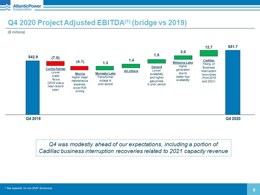 Q4 2020 Financial Highlights 7 Financial Results □ Project Adjusted EBITDA of $51.7 million vs. $42.9 million in Q4 2019 □ Cash provided by operating activities of $35.2 million vs. $40.2 million in Q4 2019 Balance Sheet □ Repaid $18.5 million of term loan and $0.8 million of project debt □ Consolidated leverage ratio (1) at December 31 of 3.6 times, or 3.4 times net of cash Capital Allocation □ No activity in Q4, pending completion of the I Squared Capital transaction □ Discretionary cash at December 31 of approximately $14 million Cadillac Insurance Recovery □ Final insurance recoveries received in December 2020 totaling $10.1 million (1) Consolidated debt to trailing 12 - month Project Adjusted EBITDA (after Corporate G&A).