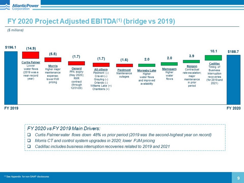 Q4 2020 Project Adjusted EBITDA (1) (bridge vs 2019) ($ millions) 8 $42.9 $51.7 Q4 2019 Q4 2020 Cadillac Timing of Business Interruption recoveries (from 2019 and 2021) 12.7 Williams Lake Higher generation due to better fuel availability 1.5 Morris Higher major maintenance expense; lower PJM pricing (4.1) Curtis Palmer Lower water flows (2019 was a near - record year) (7.0) 1.3 Oxnard Lower availability and higher gas prices in prior period 3.0 Moresby Lake Transformer outage in prior period 1.4 All others (1) See Appendix for non - GAAP disclosures Q4 was modestly ahead of our expectations, including a portion of Cadillac business interruption recoveries related to 2021 capacity revenue