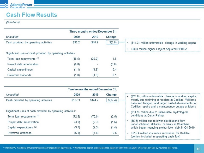 FY 2020 Project Adjusted EBITDA (1) (bridge vs 2019) ($ millions) 9 $196.1 $188.7 FY 2019 FY 2020 Cadillac Timing of Business Interruption recoveries (for 2019 and 2021) 10.1 Nipigon Contractual rate escalation; major maintenance in prior period 2.0 Morris Higher major maintenance expense; lower PJM pricing (5.5) Curtis Palmer Lower water flows (2019 was a near - record year) (14.9) (1.7) Mamquam Higher water flows 3.9 Oxnard PPA expiry (May 2020); RMR contract (through 12/31/20) (1.6) Piedmont Maintenance outages (1) See Appendix for non - GAAP disclosures FY 2020 vs FY 2019 Main Drivers: □ Curtis Palmer water flows down 48% vs prior period (2019 was the second - highest year on record) □ Morris CT and control system upgrades in 2020; lower PJM pricing □ Cadillac includes business interruption recoveries related to 2019 and 2021 (1.7) All others Piedmont ( - ) Craven ( - ) Grayling ( - ) Orlando ( - ) Williams Lake (+) Chambers (+) 2.0 Moresby Lake Higher water flows and improved availability