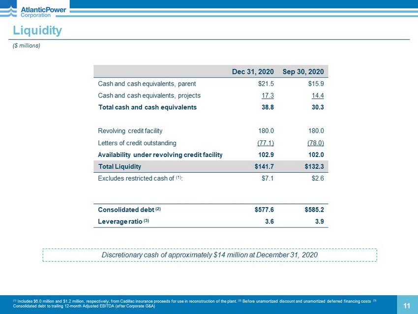 Three months ended December 31, Unaudited 2020 2019 Change Cash provided by operating activities $35.2 $40.2 $(5.0) Significant uses of cash provided by operating activities: Term loan repayments (1) (18.5) (20.0) 1.5 Project debt amortization (0.8) - (0.8) Capital expenditures (1.1) (1.5) 0.4 Preferred dividends (1.8) (1.9) 0.1 Cash Flow Results ($ millions) 10 • ($11.3) million unfavorable change in working capital • +$8.8 million higher Project Adjusted EBITDA (1) Includes 1% mandatory annual amortization and targeted debt repayments . (2) Maintenance capital; excludes Cadillac repairs of $20.8 million in 2020, which were covered by insurance recoveries. Twelve months ended December 31, Unaudited 2020 2019 Change Cash provided by operating activities $107.3 $144.7 $(37.4) Significant uses of cash provided by operating activities: Term loan repayments (1) (72.5) (70.0) (2.5) Project debt amortization (3.9) (2.3) (1.6) Capital expenditures (2) (3.7) (2.3) (1.4) Preferred dividends (6.8) (7.4) 0.6 • ($25.6) million unfavorable change in working capital, mostly due to timing of receipts at Cadillac, Williams Lake and Nipigon, and larger cash disbursements for Cadillac repairs and a maintenance outage at Morris • ($14.9) million due to unfavorable hydrological conditions at Curtis Palmer • ($5.3) million due to lower distributions from unconsolidated affiliates, primarily at Chambers, which began repaying project - level debt in Q4 2019 • +$16.4 million insurance recoveries for Cadillac (portion included in operating cash flow)