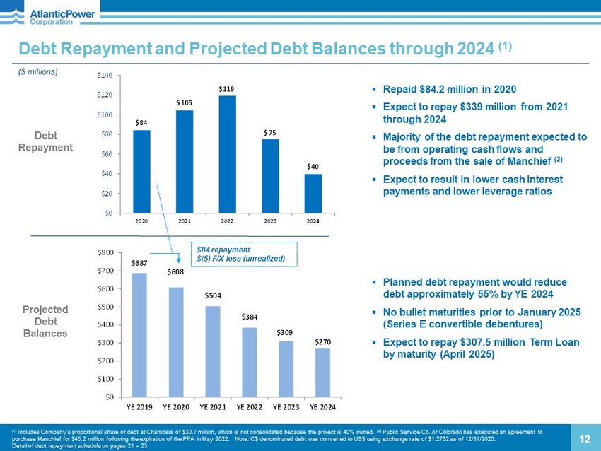 46 34 21 6 2 308 215 109 49 13 90 90 90 90 90 165 165 165 165 165 0 100 200 300 400 500 600 700 12/31/20 12/31/21 12/31/22 12/31/23 12/31/24 23 Expected Debt Repayment (December 31, 2020 – Year End 2024): • APLP Holdings Term Loan: Will fully amortize by maturity (April 2025) • Project Debt: Amortize $44, ending balance $2 (Cadillac) • APC Convertible Debentures: No repayment required prior to 2025 maturity, but callable at par in 2023 • Total Remaining Repayment through 2024: $339 (56%) Projected Debt Balances through 2024 (1) ($ millions) APLP Holdings Term Loan Project - level debt APLP Medium - term Notes (US$ equiv.) APC Convertible Debentures (US$ equiv.) $608 $309 $504 $384 $270 Actual (1) ) Includes Company’s proportional share of debt at Chambers of $30.7 million, which is not consolidated because the project is 40 % owned Note: C$ denominated debt was converted to US$ using exchange rate of 1.2732 at 12/31/20.