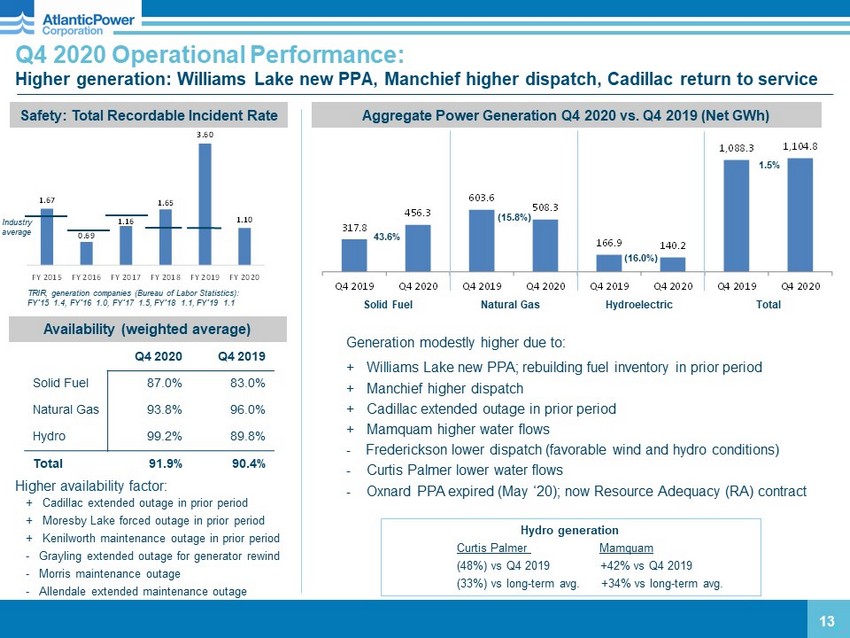 $687 $608 $504 $384 $309 $270 $0 $100 $200 $300 $400 $500 $600 $700 $800 YE 2019 YE 2020 YE 2021 YE 2022 YE 2023 YE 2024 $84 $105 $119 $75 $40 $0 $20 $40 $60 $80 $100 $120 $140 2020 2021 2022 2023 2024 Debt Repayment and Projected Debt Balances through 2024 (1) ($ millions) 12 12 (1) Includes Company’s proportional share of debt at Chambers of $30.7 million, which is not consolidated because the project is 40% owned. (2) Public Service Co. of Colorado has executed an agreement to purchase Manchief for $45.2 million following the expiration of the PPA in May 2022. Note: C$ denominated debt was converte d t o US$ using exchange rate of $1.2732 as of 12/31/2020. Detail of debt repayment schedule on pages 21 – 23. ▪ Planned debt repayment would reduce debt approximately 55% by YE 2024 ▪ No bullet maturities prior to January 2025 (Series E convertible debentures) ▪ Expect to repay $307.5 million Term Loan by maturity (April 2025) ▪ Repaid $84.2 million in 2020 ▪ Expect to repay $339 million from 2021 through 2024 ▪ Majority of the debt repayment expected to be from operating cash flows and proceeds from the sale of Manchief (2) ▪ Expect to result in lower cash interest payments and lower leverage ratios Projected Debt Balances Debt Repayment $84 repayment $(5) F/X loss (unrealized)
