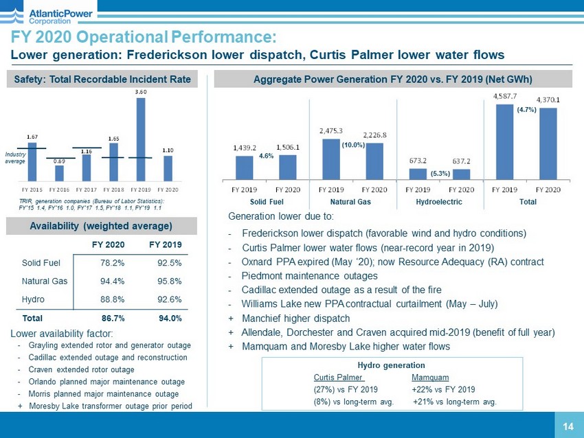 317.8 456.3 603.6 508.3 166.9 140.2 1,088.3 1,104.8 Q4 2019 Q4 2020 Q4 2019 Q4 2020 Q4 2019 Q4 2020 Q4 2019 Q4 2020 1.67 0.69 1.16 1.65 3.60 1.10 FY 2015 FY 2016 FY 2017 FY 2018 FY 2019 FY 2020 Q4 2020 Operational Performance: Higher generation: Williams Lake new PPA, Manchief higher dispatch, Cadillac return to service 13 Q4 2020 Q4 2019 Solid Fuel 87.0% 83.0% Natural Gas 93.8% 96.0% Hydro 99.2% 89.8% Total 91.9% 90.4% Aggregate Power Generation Q4 2020 vs. Q4 2019 (Net GWh) Solid Fuel Natural Gas Hydroelectric Total 43.6% (15.8%) (16.0%) 1.5% Higher availability factor: Generation modestly higher due to: + Williams Lake new PPA; rebuilding fuel inventory in prior period + Manchief higher dispatch + Cadillac extended outage in prior period + Mamquam higher water flows - Frederickson lower dispatch (favorable wind and hydro conditions) - Curtis Palmer lower water flows - Oxnard PPA expired (May ‘20); now Resource Adequacy (RA) contract + Cadillac extended outage in prior period + Moresby Lake forced outage in prior period + Kenilworth maintenance outage in prior period - Grayling extended outage for generator rewind - Morris maintenance outage - Allendale extended maintenance outage Safety: Total Recordable Incident Rate TRIR, generation companies (Bureau of Labor Statistics): FY’15 1.4, FY’16 1.0, FY’17 1.5, FY’18 1.1, FY’19 1.1 Industry average Availability (weighted average) Hydro generation Curtis Palmer Mamquam (48%) vs Q4 2019 +42% vs Q4 2019 (33%) vs long - term avg. +34% vs long - term avg.
