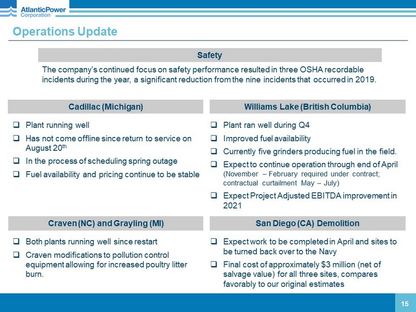 1.67 0.69 1.16 1.65 3.60 1.10 FY 2015 FY 2016 FY 2017 FY 2018 FY 2019 FY 2020 1,439.2 1,506.1 2,475.3 2,226.8 673.2 637.2 4,587.7 4,370.1 FY 2019 FY 2020 FY 2019 FY 2020 FY 2019 FY 2020 FY 2019 FY 2020 FY 2020 Operational Performance: Lower generation: Frederickson lower dispatch, Curtis Palmer lower water flows 14 FY 2020 FY 2019 Solid Fuel 78.2% 92.5% Natural Gas 94.4% 95.8% Hydro 88.8% 92.6% Total 86.7% 94.0% Aggregate Power Generation FY 2020 vs. FY 2019 (Net GWh) Solid Fuel Natural Gas Hydroelectric Total 4.6% (10.0%) (5.3%) (4.7%) Lower availability factor: - Grayling extended rotor and generator outage - Cadillac extended outage and reconstruction - Craven extended rotor outage - Orlando planned major maintenance outage - Morris planned major maintenance outage + Moresby Lake transformer outage prior period Safety: Total Recordable Incident Rate TRIR, generation companies (Bureau of Labor Statistics): FY’15 1.4, FY’16 1.0, FY’17 1.5, FY’18 1.1, FY’19 1.1 Industry average Availability (weighted average) Hydro generation Curtis Palmer Mamquam (27%) vs FY 2019 +22% vs FY 2019 (8%) vs long - term avg. +21% vs long - term avg. Generation lower due to: - Frederickson lower dispatch (favorable wind and hydro conditions) - Curtis Palmer lower water flows (near - record year in 2019) - Oxnard PPA expired (May ‘20); now Resource Adequacy (RA) contract - Piedmont maintenance outages - Cadillac extended outage as a result of the fire - Williams Lake new PPA contractual curtailment (May – July) + Manchief higher dispatch + Allendale, Dorchester and Craven acquired mid - 2019 (benefit of full year) + Mamquam and Moresby Lake higher water flows