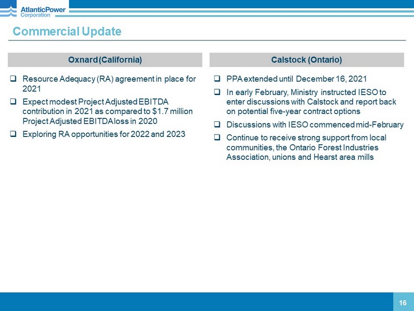 Operations Update 15 □ Plant running well □ Has not come offline since return to service on August 20 th □ In the process of scheduling spring outage □ Fuel availability and pricing continue to be stable Cadillac (Michigan) Williams Lake (British Columbia) □ Plant ran well during Q4 □ Improved fuel availability □ Currently five grinders producing fuel in the field. □ Expect to continue operation through end of April (November – February required under contract; contractual curtailment May – July) □ Expect Project Adjusted EBITDA improvement in 2021 Craven (NC) and Grayling (MI) □ Both plants running well since restart □ Craven modifications to pollution control equipment allowing for increased poultry litter burn. San Diego (CA) Demolition □ Expect work to be completed in April and sites to be turned back over to the Navy □ Final cost of approximately $3 million (net of salvage value) for all three sites, compares favorably to our original estimates The company’s continued focus on safety performance resulted in three OSHA recordable incidents during the year, a significant reduction from the nine incidents that occurred in 2019. Safety