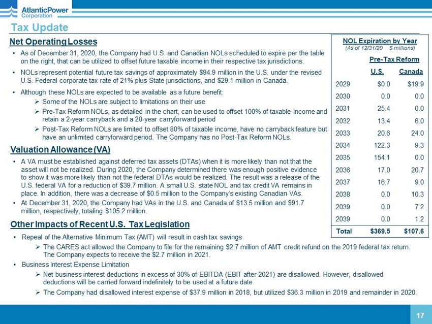 Commercial Update 16 Calstock (Ontario) □ PPA extended until December 16, 2021 □ In early February, Ministry instructed IESO to enter discussions with Calstock and report back on potential five - year contract options □ Discussions with IESO commenced mid - February □ Continue to receive strong support from local communities, the Ontario Forest Industries Association, unions and Hearst area mills Oxnard (California) □ Resource Adequacy (RA) agreement in place for 2021 □ Expect modest Project Adjusted EBITDA contribution in 2021 as compared to $1.7 million Project Adjusted EBITDA loss in 2020 □ Exploring RA opportunities for 2022 and 2023