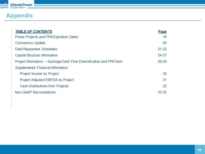 Appendix 18 TABLE OF CONTENTS Page Power Projects and PPA Expiration Dates 19 Coronavirus Update 20 Debt Repayment Schedules 21 - 23 Capital Structure Information 24 - 27 Project Information – Earnings/Cash Flow Diversification and PPA Term 28 - 29 Supplemental Financial Information Project Income by Project 30 Project Adjusted EBITDA by Project 31 Cash Distributions from Projects 32 Non - GAAP Reconciliations 33 - 35
