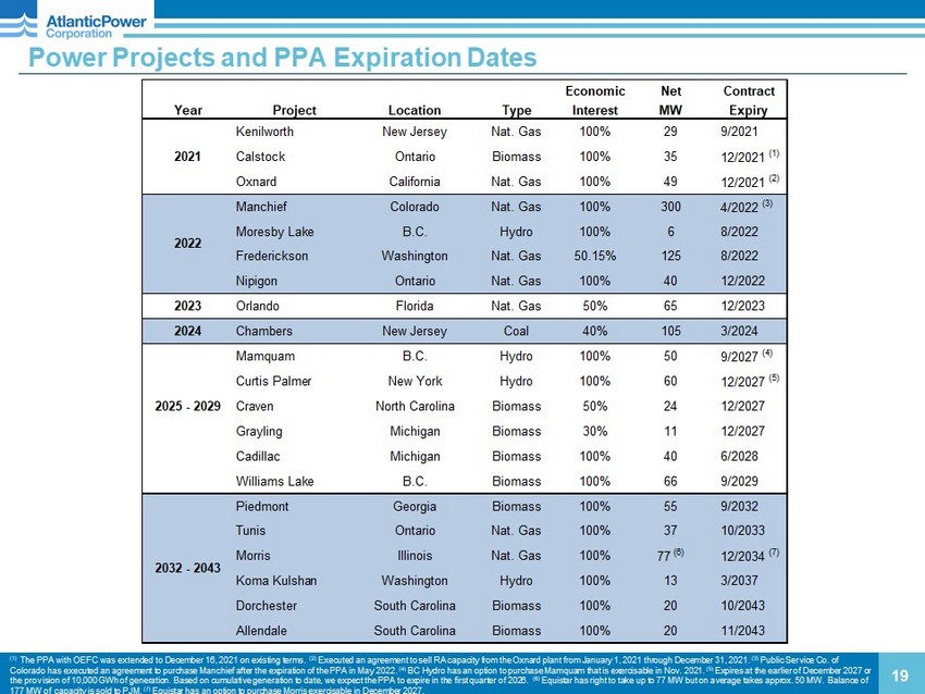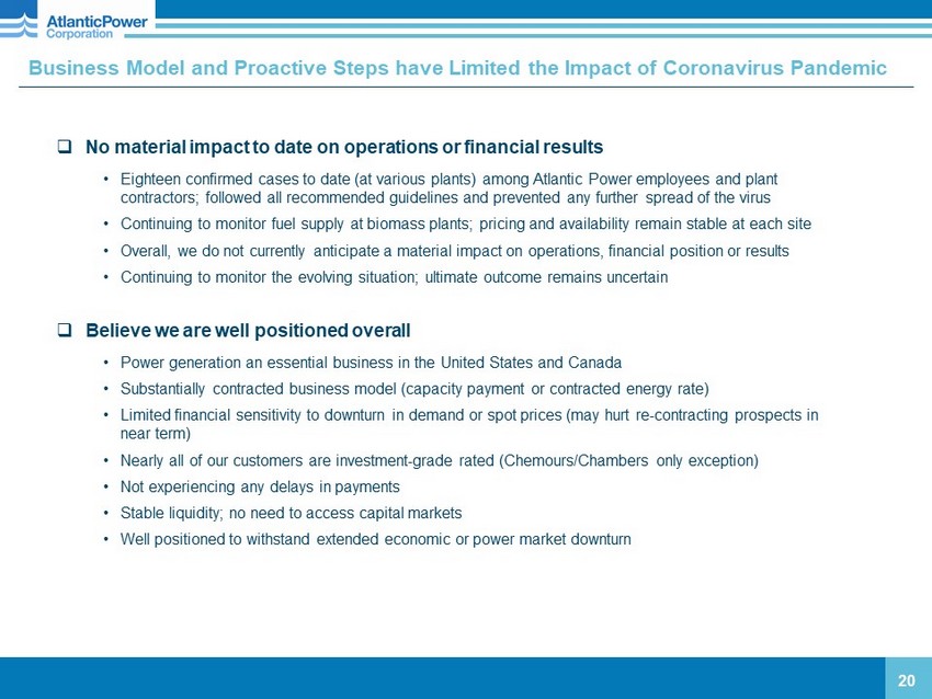 Power Projects and PPA Expiration Dates 19 (1) The PPA with OEFC was extended to December 16, 2021 on existing terms. (2) Executed an agreement to sell RA capacity from the Oxnard plant from January 1, 2021 through December 31, 2021. (3) Public Service Co. of Colorado has executed an agreement to purchase Manchief after the expiration of the PPA in May 2022. (4) BC Hydro has an option to purchase Mamquam that is exercisable in Nov. 2021. (5) Expires at the earlier of December 2027 or the provision of 10,000 GWh of generation. Based on cumulative generation to date, we expect the PPA to expire in the first q uar ter of 2026. (6) Equistar has right to take up to 77 MW but on average takes approx. 50 MW. Balance of 177 MW of capacity is sold to PJM. (7) Equistar has an option to purchase Morris exercisable in December 2027. Economic Net Contract Year Project Location Type Interest MW Expiry Kenilworth New Jersey Nat. Gas 100% 29 9/2021 Calstock Ontario Biomass 100% 35 12/2021 (1) Oxnard California Nat. Gas 100% 49 12/2021 (2) Manchief Colorado Nat. Gas 100% 300 4/2022 (3) Moresby Lake B.C. Hydro 100% 6 8/2022 Frederickson Washington Nat. Gas 50.15% 125 8/2022 Nipigon Ontario Nat. Gas 100% 40 12/2022 2023 Orlando Florida Nat. Gas 50% 65 12/2023 2024 Chambers New Jersey Coal 40% 105 3/2024 Mamquam B.C. Hydro 100% 50 9/2027 (4) Curtis Palmer New York Hydro 100% 60 12/2027 (5) 2025 - 2029 Craven North Carolina Biomass 50% 24 12/2027 Grayling Michigan Biomass 30% 11 12/2027 Cadillac Michigan Biomass 100% 40 6/2028 Williams Lake B.C. Biomass 100% 66 9/2029 Piedmont Georgia Biomass 100% 55 9/2032 Tunis Ontario Nat. Gas 100% 37 10/2033 Morris Illinois Nat. Gas 100% 77 (6) 12/2034 (7) Koma Kulshan Washington Hydro 100% 13 3/2037 Dorchester South Carolina Biomass 100% 20 10/2043 Allendale South Carolina Biomass 100% 20 11/2043 2022 2032 - 2043 2021
