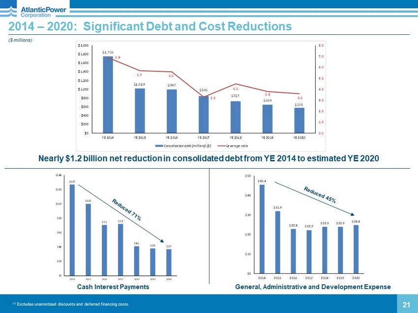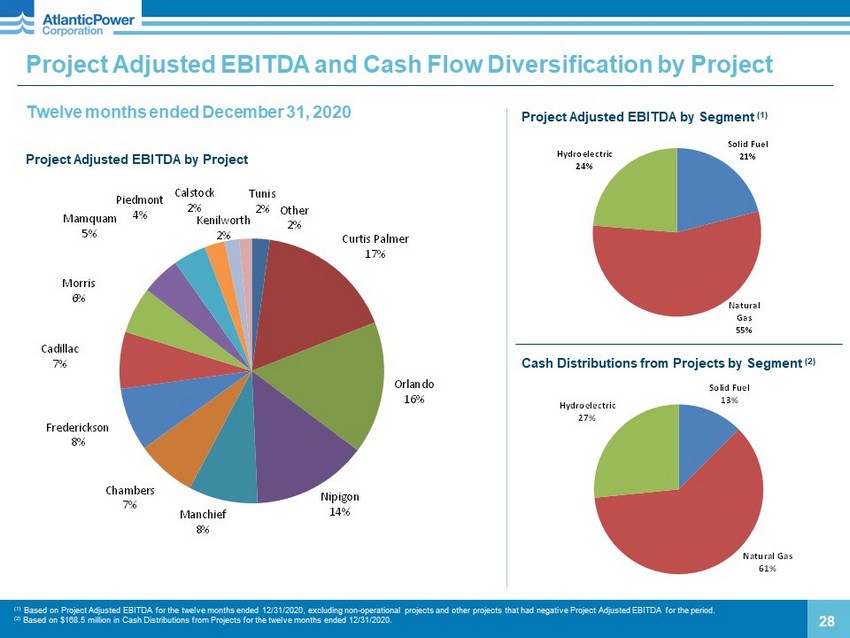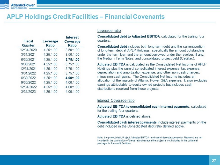 APLP Holdings Credit Facilities – Financial Covenants 27 Leverage ratio : Consolidated debt to Adjusted EBITDA , calculated for the trailing four quarters. Consolidated debt includes both long - term debt and the current portion of long - term debt at APLP Holdings, specifically the amount outstanding under the term loan and the amount borrowed under the revolver, if any, the Medium Term Notes, and consolidated project debt (Cadillac). Adjusted EBITDA is calculated as the Consolidated Net Income of APLP Holdings plus the sum of consolidated interest expense, tax expense, depreciation and amortization expense, and other non - cash charges, minus non - cash gains. The Consolidated Net Income includes an allocation of the majority of Atlantic Power G&A expense. It also excludes earnings attributable to equity - owned projects but includes cash distributions received from those projects. Interest Coverage ratio : Adjusted EBITDA to consolidated cash interest payments , calculated for the trailing four quarters. Adjusted EBITDA is defined above. Consolidated cash interest payments include interest payments on the debt included in the Consolidated debt ratio defined above. Note, the project debt, Project Adjusted EBITDA and cash interest expense for Piedmont are not included in the calculation of these ratios because the project is not included in the collateral package for the credit facilities. Fiscal Quarter Leverage Ratio Interest Coverage Ratio 12/31/2020 4.25:1.00 3.50:1.00 3/31/2021 4.25:1.00 3.50:1.00 6/30/2021 4.25:1.00 3.75:1.00 9/30/2021 4.25:1.00 3.75:1.00 12/31/2021 4.25:1.00 3.75:1.00 3/31/2022 4.25:1.00 3.75:1.00 6/30/2022 4.25:1.00 4.00:1.00 9/30/2022 4.25:1.00 4.00:1.00 12/31/2022 4.25:1.00 4.00:1.00 3/31/2023 4.25:1.00 4.00:1.00