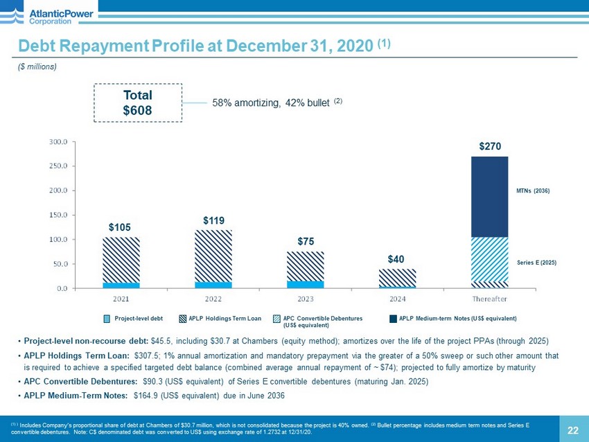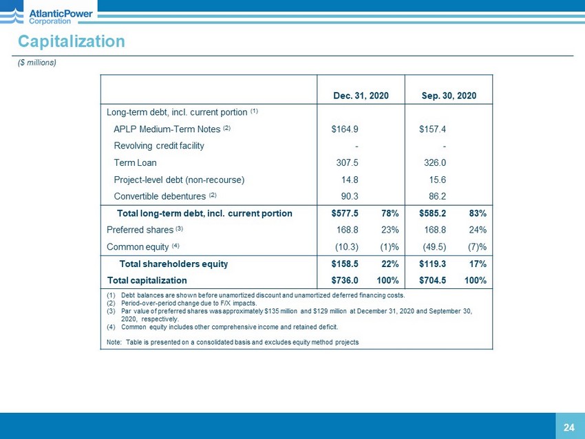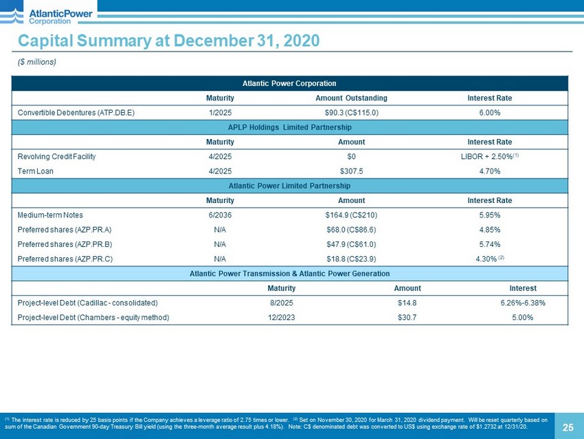 Capitalization ($ millions) 24 Dec. 31, 2020 Sep. 30, 2020 Long - term d ebt, incl. current portion (1) APLP Medium - Term Notes (2) $164.9 $157.4 Revolving credit facility - - Term Loan 307.5 326.0 P roject - level debt (non - recourse) 14.8 15.6 Convertible debentures (2) 90.3 86.2 Total long - term debt, incl. current portion $577.5 78% $585.2 83% Preferred shares (3) 168.8 23% 168.8 24% Common equity (4) (10.3) (1)% (49.5) (7)% Total shareholders equity $158.5 22% $119.3 17% Total capitalization $736.0 100% $704.5 100% (1) Debt balances are shown before unamortized discount and unamortized deferred financing costs. (2) Period - over - period change due to F/X impacts. (3) Par value of preferred shares was approximately $135 million and $129 million at December 31, 2020 and September 30, 2020, respectively. (4) Common equity includes other comprehensive income and retained deficit. Note: Table is p resented on a consolidated basis and excludes equity method projects