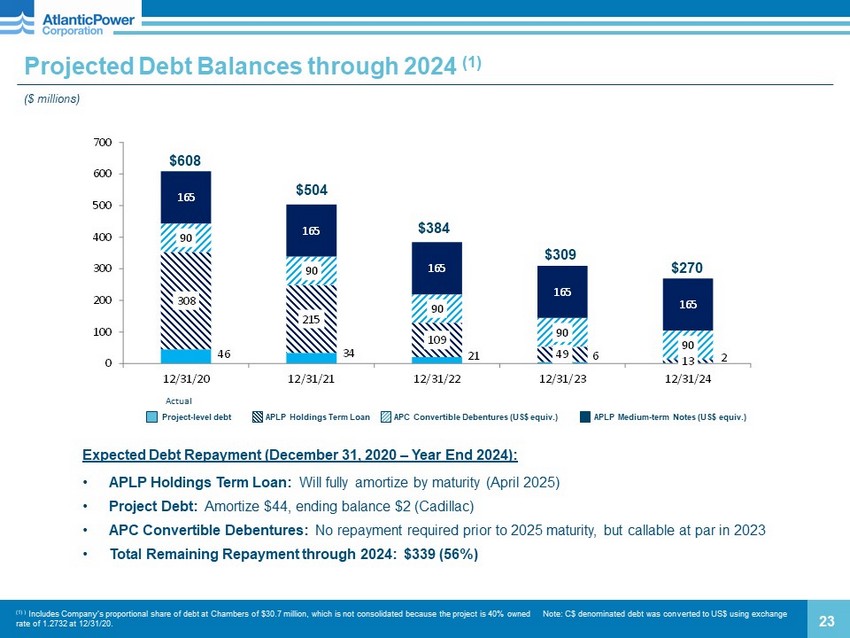 0.0 50.0 100.0 150.0 200.0 250.0 300.0 2021 2022 2023 2024 Thereafter Debt Repayment Profile at December 31, 2020 (1) ($ millions) 22 (1) ) Includes Company’s proportional share of debt at Chambers of $30.7 million, which is not consolidated because the project is 40 % owned. (2) Bullet percentage includes medium term notes and Series E convertible debentures. Note: C$ denominated debt was converted to US$ using exchange rate of 1.2732 at 12/31/20. • Project - level non - recourse debt: $45.5, including $30.7 at Chambers (equity method); amortizes over the life of the project PPAs (through 2025) • APLP Holdings Term Loan: $307.5; 1% annual amortization and mandatory prepayment via the greater of a 50% sweep or such other amount that is required to achieve a specified targeted debt balance (combined average annual repayment of ~ $74); projected to fully amo rti ze by maturity • APC Convertible Debentures: $90.3 (US$ equivalent) of Series E convertible debentures (maturing Jan. 2025) • APLP Medium - Term Notes: $164.9 (US$ equivalent) due in June 2036 Total $608 $105 $119 $270 APLP Holdings Term Loan Project - level debt APLP Medium - term Notes (US$ equivalent) APC Convertible Debentures (US$ equivalent) 58% amortizing, 42% bullet (2) $75 $40 Series E (2025) MTNs (2036)