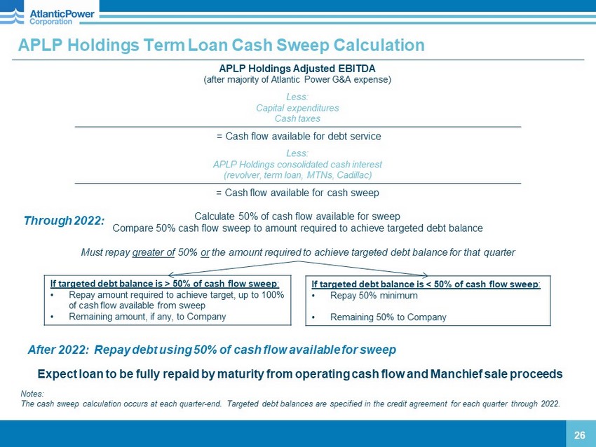 Capital Summary at December 31, 2020 ($ millions) (1) The interest rate is reduced by 25 basis points if the Company achieves a leverage ratio of 2.75 times or lower. (2) Set on November 30, 2020 for March 31, 2020 dividend payment. Will be reset quarterly based on sum of the Canadian Government 90 - day Treasury Bill yield (using the three - month average result plus 4.18%). Note: C$ denominat ed debt was converted to US$ using exchange rate of $1.2732 at 12/31/20. 25 Atlantic Power Corporation Maturity Amount Outstanding Interest Rate Convertible Debentures (ATP.DB.E) 1/2025 $90.3 (C$115.0) 6.00% APLP Holdings Limited Partnership Maturity Amount Interest Rate Revolving Credit Facility 4/2025 $0 LIBOR + 2.50% (1) Term Loan 4/2025 $307.5 4.70% Atlantic Power Limited Partnership Maturity Amount Interest Rate Medium - term Notes 6/2036 $164.9 (C$210) 5.95% Preferred shares (AZP.PR.A) N/A $68.0 (C$86.6) 4.85% Preferred shares (AZP.PR.B) N/A $47.9 (C$61.0) 5.74% Preferred shares (AZP.PR.C) N/A $18.8 (C$23.9) 4.30% (2) Atlantic Power Transmission & Atlantic Power Generation Maturity Amount Interest Project - level Debt (Cadillac - consolidated) 8/2025 $14.8 6.26% - 6.38% Project - level Debt (Chambers - equity method) 12/2023 $30.7 5.00%