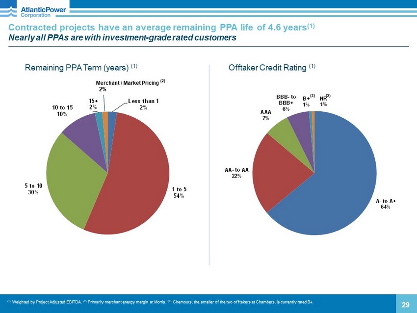Solid Fuel 21% Natural Gas 55% Hydroelectric 24% Other 2% Curtis Palmer 17% Orlando 16% Nipigon 14% Manchief 8% Chambers 7% Frederickson 8% Cadillac 7% Morris 6% Mamquam 5% Piedmont 4% Calstock 2% Kenilworth 2% Tunis 2% Twelve months ended December 31, 2020 Project Adjusted EBITDA by Project 28 Project Adjusted EBITDA and Cash Flow Diversification by Project (1) Based on Project Adjusted EBITDA for the twelve months ended 12/31/2020, excluding non - operational projects and other projects t hat had negative Project Adjusted EBITDA for the period. (2) Based on $168.5 million in Cash Distributions from Projects for the twelve months ended 12/31/2020. Cash Distributions from Projects by Segment (2) Project Adjusted EBITDA by Segment (1) Solid Fuel 13% Natural Gas 61% Hydroelectric 27%