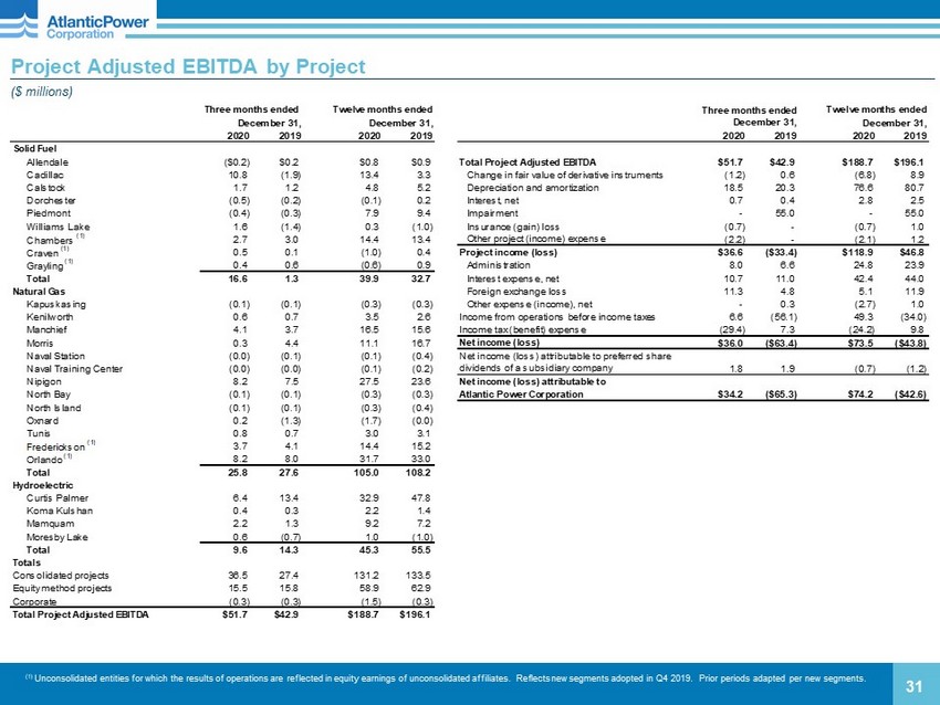 Project Income (Loss) by Project ($ millions) 30 (1) Unconsolidated entities for which the results of operations are reflected in equity earnings of unconsolidated affiliates. Re fle cts new segments adopted in Q4 2019. Prior periods adapted per new segments. Three months ended Twelve months ended December 31, December 31, 2020 2019 2020 2019 Solid Fuel Allendale ($0.3) $0.1 $0.6 $0.8 Cadillac 10.3 (2.8) 10.3 (2.3) Calstock 1.6 (5.1) 4.4 (2.7) Dorchester (0.5) (0.3) (0.2) 0.2 Piedmont (2.2) (2.1) 0.5 2.1 Williams Lake 1.1 (1.9) (1.7) (2.8) Chambers (1) 0.1 (48.6) 4.4 (46.0) Craven (1) 0.3 (0.0) (1.8) 0.2 Grayling (1) 0.3 0.5 (1.1) 0.8 Total 10.8 (60.2) 15.2 (49.8) Natural Gas Kapuskasing (0.1) (0.1) (0.3) (0.3) Kenilworth 0.4 0.1 1.3 (0.1) Manchief 1.3 0.9 5.5 4.6 Morris (0.8) 3.1 3.4 10.2 Naval Station 0.9 (0.1) 0.8 (0.8) Naval Training Center 0.5 (0.1) 0.4 (0.8) Nipigon 7.0 5.7 29.4 22.2 North Bay (0.1) (0.1) (0.3) (0.3) North Island 0.6 (0.0) 0.5 (0.6) Oxnard 0.2 (2.3) (3.5) (4.1) Tunis 0.5 0.5 2.0 2.1 Frederickson (1) 2.1 2.6 8.3 9.1 Orlando (1) 7.0 6.7 34.1 27.5 Total 19.7 16.9 81.7 68.5 Hydroelectric Curtis Palmer 2.6 9.6 17.5 32.4 Koma Kulshan - (0.1) 0.7 (0.1) Mamquam 1.8 0.9 7.5 5.6 Moresby Lake 0.3 (0.9) 0.1 (1.9) Total 4.7 9.4 25.7 36.0 Totals Consolidated projects 25.3 5.0 78.7 63.1 Equity method projects 9.9 (38.8) 43.9 (8.5) Corporate 1.4 0.5 (3.7) (7.9) Total Project Income (loss) $36.6 ($33.4) $118.9 $46.8
