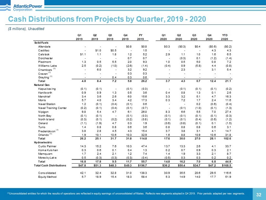 31 Project Adjusted EBITDA by Project ($ millions) (1) Unconsolidated entities for which the results of operations are reflected in equity earnings of unconsolidated affiliates. R efl ects new segments adopted in Q4 2019. Prior periods adapted per new segments. Three months ended December 31, December 31, December 31, 2020 2019 2020 2019 2020 2019 2020 2019 Solid Fuel Allendale ($0.2) $0.2 $0.8 $0.9 Total Project Adjusted EBITDA $51.7 $42.9 $188.7 $196.1 Cadillac 10.8 (1.9) 13.4 3.3 Change in fair value of derivative instruments (1.2) 0.6 (6.8) 8.9 Calstock 1.7 1.2 4.8 5.2 Depreciation and amortization 18.5 20.3 76.6 80.7 Dorchester (0.5) (0.2) (0.1) 0.2 Interest, net 0.7 0.4 2.8 2.5 Piedmont (0.4) (0.3) 7.9 9.4 Impairment - 55.0 - 55.0 Williams Lake 1.6 (1.4) 0.3 (1.0) Insurance (gain) loss (0.7) - (0.7) 1.0 Chambers (1) 2.7 3.0 14.4 13.4 Other project (income) expense (2.2) - (2.1) 1.2 Craven (1) 0.5 0.1 (1.0) 0.4 Project income (loss) $36.6 ($33.4) $118.9 $46.8 Grayling (1) 0.4 0.6 (0.6) 0.9 Administration 8.0 6.6 24.8 23.9 Total 16.6 1.3 39.9 32.7 Interest expense, net 10.7 11.0 42.4 44.0 Natural Gas Foreign exchange loss 11.3 4.8 5.1 11.9 Kapuskasing (0.1) (0.1) (0.3) (0.3) Other expense (income), net - 0.3 (2.7) 1.0 Kenilworth 0.6 0.7 3.5 2.6 Income from operations before income taxes 6.6 (56.1) 49.3 (34.0) Manchief 4.1 3.7 16.5 15.6 Income tax (benefit) expense (29.4) 7.3 (24.2) 9.8 Morris 0.3 4.4 11.1 16.7 Net income (loss) $36.0 ($63.4) $73.5 ($43.8) Naval Station (0.0) (0.1) (0.1) (0.4) Net income (loss) attributable to preferred share Naval Training Center (0.0) (0.0) (0.1) (0.2) dividends of a subsidiary company 1.8 1.9 (0.7) (1.2) Nipigon 8.2 7.5 27.5 23.6 North Bay (0.1) (0.1) (0.3) (0.3) $34.2 ($65.3) $74.2 ($42.6) North Island (0.1) (0.1) (0.3) (0.4) Oxnard 0.2 (1.3) (1.7) (0.0) Tunis 0.8 0.7 3.0 3.1 Frederickson (1) 3.7 4.1 14.4 15.2 Orlando (1) 8.2 8.0 31.7 33.0 Total 25.8 27.6 105.0 108.2 Hydroelectric Curtis Palmer 6.4 13.4 32.9 47.8 Koma Kulshan 0.4 0.3 2.2 1.4 Mamquam 2.2 1.3 9.2 7.2 Moresby Lake 0.6 (0.7) 1.0 (1.0) Total 9.6 14.3 45.3 55.5 Totals Consolidated projects 36.5 27.4 131.2 133.5 Equity method projects 15.5 15.8 58.9 62.9 Corporate (0.3) (0.3) (1.5) (0.3) Total Project Adjusted EBITDA $51.7 $42.9 $188.7 $196.1 Twelve months ended Atlantic Power Corporation Net income (loss) attributable to Three months ended Twelve months ended December 31,