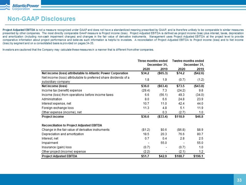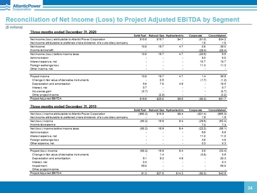 Non - GAAP Disclosures Project Adjusted EBITDA is not a measure recognized under GAAP and does not have a standardized meaning prescribed by GAAP, and is therefore unlikely to be comparable to similar measures presented by other companies . The most directly comparable GAAP measure is Project income (loss) . Project Adjusted EBITDA is defined as project income (loss) plus interest, taxes, depreciation and amortization (including non - cash impairment charges) and changes in the fair value of derivative instruments . Management uses Project Adjusted EBITDA at the project level to provide comparative information about project performance and believes such information is helpful to investors . A reconciliation of Project Adjusted EBITDA to Project income (loss) and to Net income (loss) by segment and on a consolidated basis is provided on pages 34 - 35 . Investors are cautioned that the Company may calculate these measures in a manner that is different from other companies . 33 2020 2019 2020 2019 Net income (loss) attributable to Atlantic Power Corporation $34.2 ($65.3) $74.2 ($42.6) Net income (loss) attributable to preferred share dividends of a subsidiary company 1.8 1.9 (0.7) (1.2) Net income (loss) $36.0 ($63.4) $73.5 ($43.8) Income tax (benefit) expense (29.4) 7.3 (24.2) 9.8 Income (loss) from operations before income taxes 6.6 (56.1) 49.3 (34.0) Administration 8.0 6.6 24.8 23.9 Interest expense, net 10.7 11.0 42.4 44.0 Foreign exchange loss 11.3 4.8 5.1 11.9 Other expense (income), net - 0.3 (2.7) 1.0 Project income $36.6 ($33.4) $118.9 $46.8 Reconciliation to Project Adjusted EBITDA Change in the fair value of derivative instruments ($1.2) $0.6 ($6.8) $8.9 Depreciation and amortization 18.5 20.3 76.6 80.7 Interest, net 0.7 0.4 2.8 2.5 Impairment - 55.0 - 55.0 Insurance (gain) loss (0.7) - (0.7) 1.0 Other project (income) expense (2.2) - (2.1) 1.2 Project Adjusted EBITDA $51.7 $42.9 $188.7 $196.1 December 31, December 31, Three months ended Twelve months ended