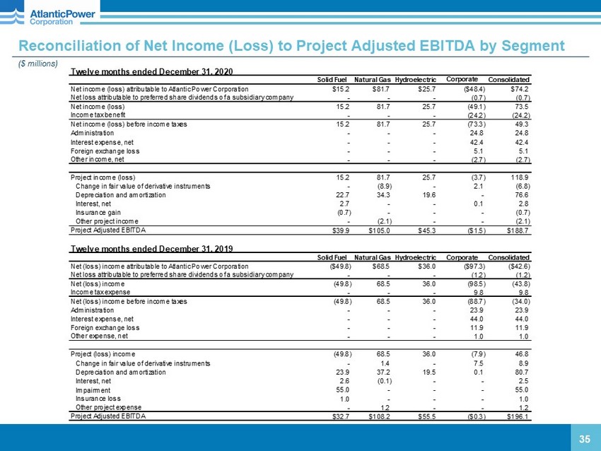 34 Reconciliation of Net Income (Loss) to Project Adjusted EBITDA by Segment ($ millions) Three months ended December 31, 2020 Solid Fuel Natural Gas Hydroelectric Corporate Consolidated Net income (loss) attributable to Atlantic Power Corporation $10.8 $19.7 $4.7 ($1.0) $34.2 Net income attributable to preferred share dividends of a subsidiary company - - - 1.8 1.8 Net income 10.8 19.7 4.7 0.8 36.0 Income tax benefit - - - (29.4) (29.4) Net income (loss) before income taxes 10.8 19.7 4.7 (28.6) 6.6 Administration - - - 8.0 8.0 Interest expense, net - - - 10.7 10.7 Foreign exchange loss - - - 11.3 11.3 Other income, net - - - - - Project income 10.8 19.7 4.7 1.4 36.6 Change in fair value of derivative instruments - 0.5 - (1.7) (1.2) Depreciation and amortization 5.8 7.8 4.9 - 18.5 Interest, net 0.7 - - - 0.7 Insurance gain (0.7) - - - (0.7) Other project income - (2.2) - - (2.2) Project Adjusted EBITDA $16.6 $25.8 $9.6 ($0.3) $51.7 Three months ended December 31, 2019 Solid Fuel Natural Gas Hydroelectric Corporate Consolidated Net (loss) income attributable to Atlantic Power Corporation ($60.2) $16.9 $9.4 ($31.4) ($65.3) Net income attributable to preferred share dividends of a subsidiary company - - - 1.9 1.9 Net (loss) income (60.2) 16.9 9.4 (29.5) (63.4) Income tax expense - - - 7.3 7.3 Net (loss) income before income taxes (60.2) 16.9 9.4 (22.2) (56.1) Administration - - - 6.6 6.6 Interest expense, net - - - 11.0 11.0 Foreign exchange loss - - - 4.8 4.8 Other expense, net - - - 0.3 0.3 Project (loss) income (60.2) 16.9 9.4 0.5 (33.4) Change in fair value of derivative instruments - 1.4 - (0.8) 0.6 Depreciation and amortization 6.1 9.3 4.9 - 20.3 Interest, net 0.4 - - - 0.4 Impairment 55.0 - - - 55.0 Other project income - - - - - Project Adjusted EBITDA $1.3 $27.6 $14.3 ($0.3) $42.9