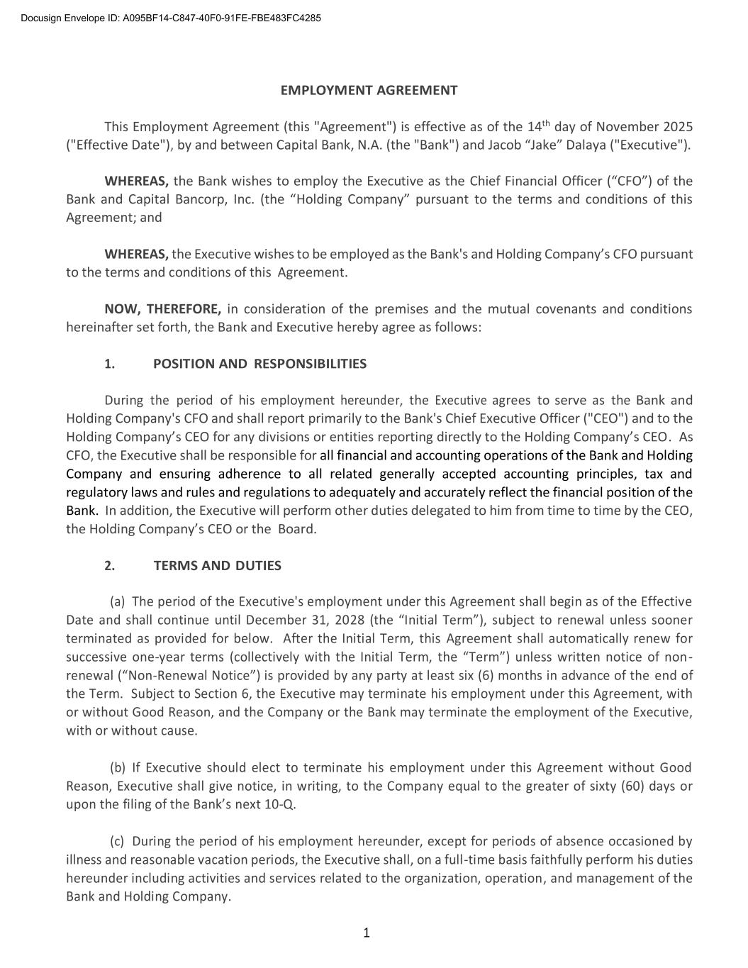 1 EMPLOYMENT AGREEMENT This Employment Agreement (this "Agreement") is effective as of the 14th day of November 2025 ("Effective Date"), by and between Capital Bank, N.A. (the "Bank") and Jacob “Jake” Dalaya ("Executive"). WHEREAS, the Bank wishes to employ the Executive as the Chief Financial Officer (“CFO”) of the Bank and Capital Bancorp, Inc. (the “Holding Company” pursuant to the terms and conditions of this Agreement; and WHEREAS, the Executive wishes to be employed as the Bank's and Holding Company’s CFO pursuant to the terms and conditions of this Agreement. NOW, THEREFORE, in consideration of the premises and the mutual covenants and conditions hereinafter set forth, the Bank and Executive hereby agree as follows: 1. POSITION AND RESPONSIBILITIES During the period of his employment hereunder, the Executive agrees to serve as the Bank and Holding Company's CFO and shall report primarily to the Bank's Chief Executive Officer ("CEO") and to the Holding Company’s CEO for any divisions or entities reporting directly to the Holding Company’s CEO. As CFO, the Executive shall be responsible for all financial and accounting operations of the Bank and Holding Company and ensuring adherence to all related generally accepted accounting principles, tax and regulatory laws and rules and regulations to adequately and accurately reflect the financial position of the Bank. In addition, the Executive will perform other duties delegated to him from time to time by the CEO, the Holding Company’s CEO or the Board. 2. TERMS AND DUTIES (a) The period of the Executive's employment under this Agreement shall begin as of the Effective Date and shall continue until December 31, 2028 (the “Initial Term”), subject to renewal unless sooner terminated as provided for below. After the Initial Term, this Agreement shall automatically renew for successive one-year terms (collectively with the Initial Term, the “Term”) unless written notice of non - renewal (“Non-Renewal Notice”) is provided by any party at least six (6) months in advance of the end of the Term. Subject to Section 6, the Executive may terminate his employment under this Agreement, with or without Good Reason, and the Company or the Bank may terminate the employment of the Executive, with or without cause. (b) If Executive should elect to terminate his employment under this Agreement without Good Reason, Executive shall give notice, in writing, to the Company equal to the greater of sixty (60) days or upon the filing of the Bank’s next 10-Q. (c) During the period of his employment hereunder, except for periods of absence occasioned by illness and reasonable vacation periods, the Executive shall, on a full-time basis faithfully perform his duties hereunder including activities and services related to the organization, operation, and management of the Bank and Holding Company. Docusign Envelope ID: A095BF14-C847-40F0-91FE-FBE483FC4285