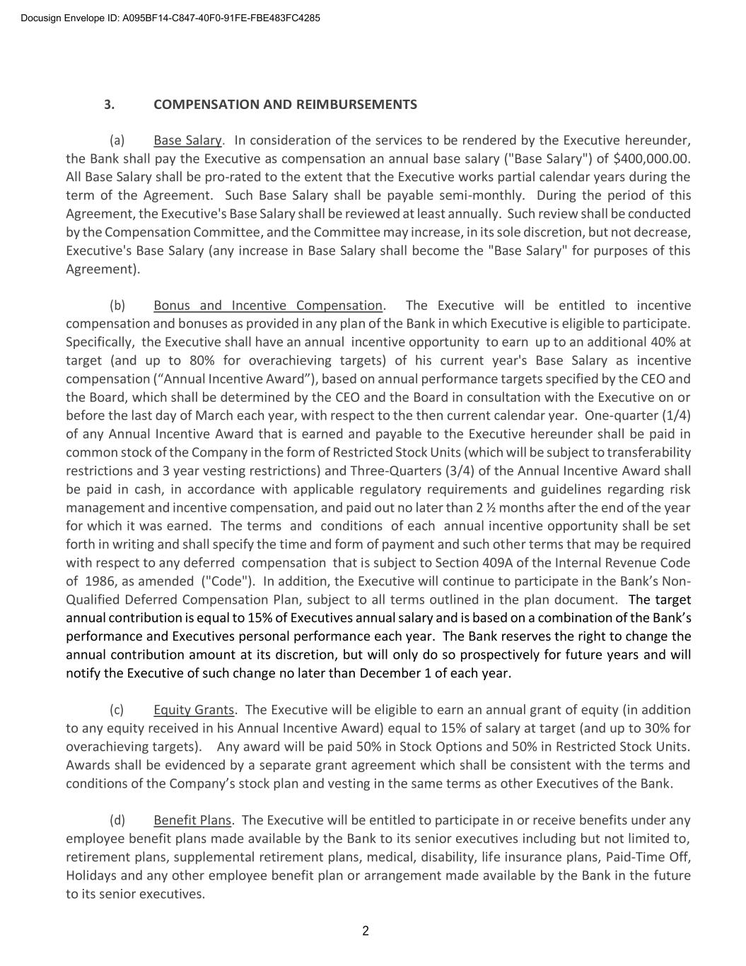 2 3. COMPENSATION AND REIMBURSEMENTS (a) Base Salary. In consideration of the services to be rendered by the Executive hereunder, the Bank shall pay the Executive as compensation an annual base salary ("Base Salary") of $400,000.00. All Base Salary shall be pro-rated to the extent that the Executive works partial calendar years during the term of the Agreement. Such Base Salary shall be payable semi-monthly. During the period of this Agreement, the Executive's Base Salary shall be reviewed at least annually. Such review shall be conducted by the Compensation Committee, and the Committee may increase, in its sole discretion, but not decrease, Executive's Base Salary (any increase in Base Salary shall become the "Base Salary" for purposes of this Agreement). (b) Bonus and Incentive Compensation. The Executive will be entitled to incentive compensation and bonuses as provided in any plan of the Bank in which Executive is eligible to participate. Specifically, the Executive shall have an annual incentive opportunity to earn up to an additional 40% at target (and up to 80% for overachieving targets) of his current year's Base Salary as incentive compensation (“Annual Incentive Award”), based on annual performance targets specified by the CEO and the Board, which shall be determined by the CEO and the Board in consultation with the Executive on or before the last day of March each year, with respect to the then current calendar year. One-quarter (1/4) of any Annual Incentive Award that is earned and payable to the Executive hereunder shall be paid in common stock of the Company in the form of Restricted Stock Units (which will be subject to transferability restrictions and 3 year vesting restrictions) and Three-Quarters (3/4) of the Annual Incentive Award shall be paid in cash, in accordance with applicable regulatory requirements and guidelines regarding risk management and incentive compensation, and paid out no later than 2 ½ months after the end of the year for which it was earned. The terms and conditions of each annual incentive opportunity shall be set forth in writing and shall specify the time and form of payment and such other terms that may be required with respect to any deferred compensation that is subject to Section 409A of the Internal Revenue Code of 1986, as amended ("Code"). In addition, the Executive will continue to participate in the Bank’s Non- Qualified Deferred Compensation Plan, subject to all terms outlined in the plan document. The target annual contribution is equal to 15% of Executives annual salary and is based on a combination of the Bank’s performance and Executives personal performance each year. The Bank reserves the right to change the annual contribution amount at its discretion, but will only do so prospectively for future years and will notify the Executive of such change no later than December 1 of each year. (c) Equity Grants. The Executive will be eligible to earn an annual grant of equity (in addition to any equity received in his Annual Incentive Award) equal to 15% of salary at target (and up to 30% for overachieving targets). Any award will be paid 50% in Stock Options and 50% in Restricted Stock Units. Awards shall be evidenced by a separate grant agreement which shall be consistent with the terms and conditions of the Company’s stock plan and vesting in the same terms as other Executives of the Bank. (d) Benefit Plans. The Executive will be entitled to participate in or receive benefits under any employee benefit plans made available by the Bank to its senior executives including but not limited to, retirement plans, supplemental retirement plans, medical, disability, life insurance plans, Paid-Time Off, Holidays and any other employee benefit plan or arrangement made available by the Bank in the future to its senior executives. Docusign Envelope ID: A095BF14-C847-40F0-91FE-FBE483FC4285