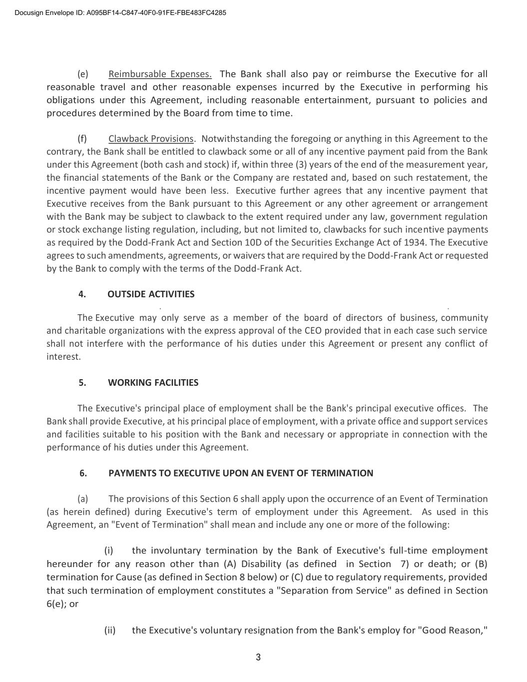 3 (e) Reimbursable Expenses. The Bank shall also pay or reimburse the Executive for all reasonable travel and other reasonable expenses incurred by the Executive in performing his obligations under this Agreement, including reasonable entertainment, pursuant to policies and procedures determined by the Board from time to time. (f) Clawback Provisions. Notwithstanding the foregoing or anything in this Agreement to the contrary, the Bank shall be entitled to clawback some or all of any incentive payment paid from the Bank under this Agreement (both cash and stock) if, within three (3) years of the end of the measurement year, the financial statements of the Bank or the Company are restated and, based on such restatement, the incentive payment would have been less. Executive further agrees that any incentive payment that Executive receives from the Bank pursuant to this Agreement or any other agreement or arrangement with the Bank may be subject to clawback to the extent required under any law, government regulation or stock exchange listing regulation, including, but not limited to, clawbacks for such incentive payments as required by the Dodd-Frank Act and Section 10D of the Securities Exchange Act of 1934. The Executive agrees to such amendments, agreements, or waivers that are required by the Dodd-Frank Act or requested by the Bank to comply with the terms of the Dodd-Frank Act. 4. OUTSIDE ACTIVITIES . . The Executive may only serve as a member of the board of directors of business, community and charitable organizations with the express approval of the CEO provided that in each case such service shall not interfere with the performance of his duties under this Agreement or present any conflict of interest. 5. WORKING FACILITIES The Executive's principal place of employment shall be the Bank's principal executive offices. The Bank shall provide Executive, at his principal place of employment, with a private office and support services and facilities suitable to his position with the Bank and necessary or appropriate in connection with the performance of his duties under this Agreement. 6. PAYMENTS TO EXECUTIVE UPON AN EVENT OF TERMINATION (a) The provisions of this Section 6 shall apply upon the occurrence of an Event of Termination (as herein defined) during Executive's term of employment under this Agreement. As used in this Agreement, an "Event of Termination" shall mean and include any one or more of the following: (i) the involuntary termination by the Bank of Executive's full-time employment hereunder for any reason other than (A) Disability (as defined in Section 7) or death; or (B) termination for Cause (as defined in Section 8 below) or (C) due to regulatory requirements, provided that such termination of employment constitutes a "Separation from Service" as defined in Section 6(e); or (ii) the Executive's voluntary resignation from the Bank's employ for "Good Reason," Docusign Envelope ID: A095BF14-C847-40F0-91FE-FBE483FC4285