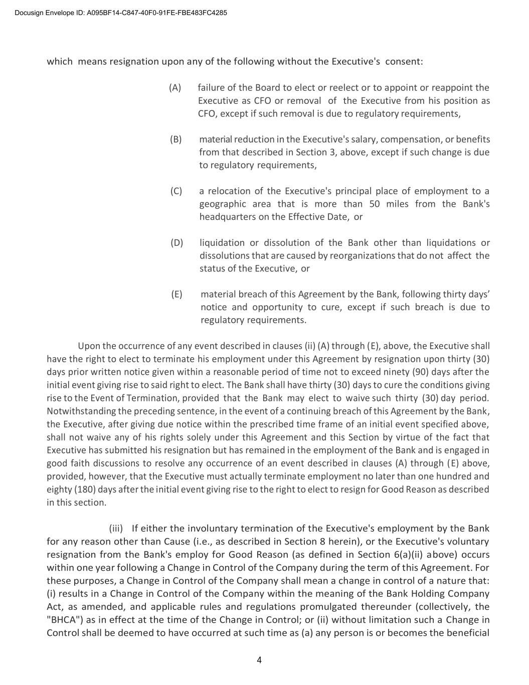 4 which means resignation upon any of the following without the Executive's consent: (A) failure of the Board to elect or reelect or to appoint or reappoint the Executive as CFO or removal of the Executive from his position as CFO, except if such removal is due to regulatory requirements, (B) material reduction in the Executive's salary, compensation, or benefits from that described in Section 3, above, except if such change is due to regulatory requirements, (C) a relocation of the Executive's principal place of employment to a geographic area that is more than 50 miles from the Bank's headquarters on the Effective Date, or (D) liquidation or dissolution of the Bank other than liquidations or dissolutions that are caused by reorganizations that do not affect the status of the Executive, or (E) material breach of this Agreement by the Bank, following thirty days’ notice and opportunity to cure, except if such breach is due to regulatory requirements. Upon the occurrence of any event described in clauses (ii) (A) through (E), above, the Executive shall have the right to elect to terminate his employment under this Agreement by resignation upon thirty (30) days prior written notice given within a reasonable period of time not to exceed ninety (90) days after the initial event giving rise to said right to elect. The Bank shall have thirty (30) days to cure the conditions giving rise to the Event of Termination, provided that the Bank may elect to waive such thirty (30) day period. Notwithstanding the preceding sentence, in the event of a continuing breach of this Agreement by the Bank, the Executive, after giving due notice within the prescribed time frame of an initial event specified above, shall not waive any of his rights solely under this Agreement and this Section by virtue of the fact that Executive has submitted his resignation but has remained in the employment of the Bank and is engaged in good faith discussions to resolve any occurrence of an event described in clauses (A) through (E) above, provided, however, that the Executive must actually terminate employment no later than one hundred and eighty (180) days after the initial event giving rise to the right to elect to resign for Good Reason as described in this section. (iii) If either the involuntary termination of the Executive's employment by the Bank for any reason other than Cause (i.e., as described in Section 8 herein), or the Executive's voluntary resignation from the Bank's employ for Good Reason (as defined in Section 6(a)(ii) above) occurs within one year following a Change in Control of the Company during the term of this Agreement. For these purposes, a Change in Control of the Company shall mean a change in control of a nature that: (i) results in a Change in Control of the Company within the meaning of the Bank Holding Company Act, as amended, and applicable rules and regulations promulgated thereunder (collectively, the "BHCA") as in effect at the time of the Change in Control; or (ii) without limitation such a Change in Control shall be deemed to have occurred at such time as (a) any person is or becomes the beneficial Docusign Envelope ID: A095BF14-C847-40F0-91FE-FBE483FC4285