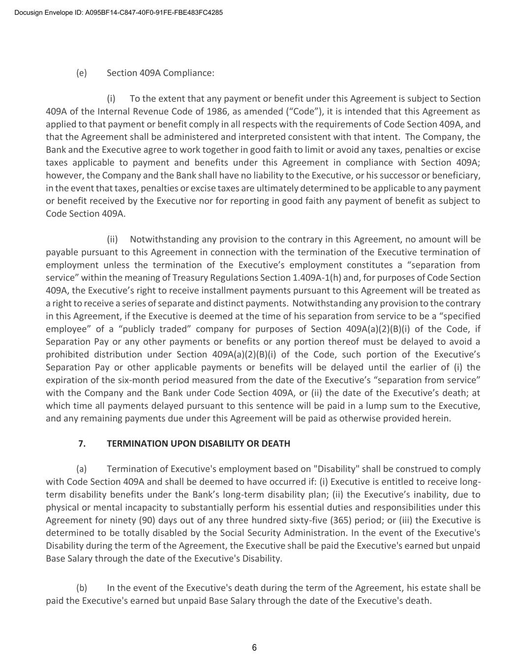 6 (e) Section 409A Compliance: (i) To the extent that any payment or benefit under this Agreement is subject to Section 409A of the Internal Revenue Code of 1986, as amended (“Code”), it is intended that this Agreement as applied to that payment or benefit comply in all respects with the requirements of Code Section 409A, and that the Agreement shall be administered and interpreted consistent with that intent. The Company, the Bank and the Executive agree to work together in good faith to limit or avoid any taxes, penalties or excise taxes applicable to payment and benefits under this Agreement in compliance with Section 409A; however, the Company and the Bank shall have no liability to the Executive, or his successor or beneficiary, in the event that taxes, penalties or excise taxes are ultimately determined to be applicable to any payment or benefit received by the Executive nor for reporting in good faith any payment of benefit as subject to Code Section 409A. (ii) Notwithstanding any provision to the contrary in this Agreement, no amount will be payable pursuant to this Agreement in connection with the termination of the Executive termination of employment unless the termination of the Executive’s employment constitutes a “separation from service” within the meaning of Treasury Regulations Section 1.409A-1(h) and, for purposes of Code Section 409A, the Executive’s right to receive installment payments pursuant to this Agreement will be treated as a right to receive a series of separate and distinct payments. Notwithstanding any provision to the contrary in this Agreement, if the Executive is deemed at the time of his separation from service to be a “specified employee” of a “publicly traded” company for purposes of Section 409A(a)(2)(B)(i) of the Code, if Separation Pay or any other payments or benefits or any portion thereof must be delayed to avoid a prohibited distribution under Section 409A(a)(2)(B)(i) of the Code, such portion of the Executive’s Separation Pay or other applicable payments or benefits will be delayed until the earlier of (i) the expiration of the six-month period measured from the date of the Executive’s “separation from service” with the Company and the Bank under Code Section 409A, or (ii) the date of the Executive’s death; at which time all payments delayed pursuant to this sentence will be paid in a lump sum to the Executive, and any remaining payments due under this Agreement will be paid as otherwise provided herein. 7. TERMINATION UPON DISABILITY OR DEATH (a) Termination of Executive's employment based on "Disability" shall be construed to comply with Code Section 409A and shall be deemed to have occurred if: (i) Executive is entitled to receive long- term disability benefits under the Bank’s long-term disability plan; (ii) the Executive’s inability, due to physical or mental incapacity to substantially perform his essential duties and responsibilities under this Agreement for ninety (90) days out of any three hundred sixty-five (365) period; or (iii) the Executive is determined to be totally disabled by the Social Security Administration. In the event of the Executive's Disability during the term of the Agreement, the Executive shall be paid the Executive's earned but unpaid Base Salary through the date of the Executive's Disability. (b) In the event of the Executive's death during the term of the Agreement, his estate shall be paid the Executive's earned but unpaid Base Salary through the date of the Executive's death. Docusign Envelope ID: A095BF14-C847-40F0-91FE-FBE483FC4285
