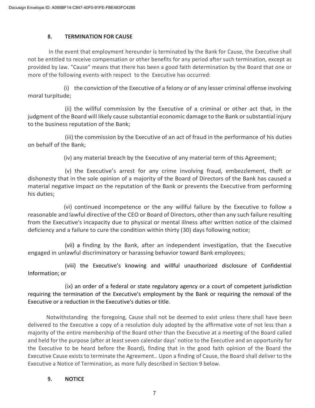 7 8. TERMINATION FOR CAUSE In the event that employment hereunder is terminated by the Bank for Cause, the Executive shall not be entitled to receive compensation or other benefits for any period after such termination, except as provided by law. "Cause" means that there has been a good faith determination by the Board that one or more of the following events with respect to the Executive has occurred: (i) the conviction of the Executive of a felony or of any lesser criminal offense involving moral turpitude; (ii) the willful commission by the Executive of a criminal or other act that, in the judgment of the Board will likely cause substantial economic damage to the Bank or substantial injury to the business reputation of the Bank; (iii) the commission by the Executive of an act of fraud in the performance of his duties on behalf of the Bank; (iv) any material breach by the Executive of any material term of this Agreement; (v) the Executive’s arrest for any crime involving fraud, embezzlement, theft or dishonesty that in the sole opinion of a majority of the Board of Directors of the Bank has caused a material negative impact on the reputation of the Bank or prevents the Executive from performing his duties; (vi) continued incompetence or the any willful failure by the Executive to follow a reasonable and lawful directive of the CEO or Board of Directors, other than any such failure resulting from the Executive's incapacity due to physical or mental illness after written notice of the claimed deficiency and a failure to cure the condition within thirty (30) days following notice; (vii) a finding by the Bank, after an independent investigation, that the Executive engaged in unlawful discriminatory or harassing behavior toward Bank employees; (viii) the Executive’s knowing and willful unauthorized disclosure of Confidential Information; or (ix) an order of a federal or state regulatory agency or a court of competent jurisdiction requiring the termination of the Executive's employment by the Bank or requiring the removal of the Executive or a reduction in the Executive's duties or title. Notwithstanding the foregoing, Cause shall not be deemed to exist unless there shall have been delivered to the Executive a copy of a resolution duly adopted by the affirmative vote of not less than a majority of the entire membership of the Board other than the Executive at a meeting of the Board called and held for the purpose (after at least seven calendar days’ notice to the Executive and an opportunity for the Executive to be heard before the Board), finding that in the good faith opinion of the Board the Executive Cause exists to terminate the Agreement.. Upon a finding of Cause, the Board shall deliver to the Executive a Notice of Termination, as more fully described in Section 9 below. 9. NOTICE Docusign Envelope ID: A095BF14-C847-40F0-91FE-FBE483FC4285
