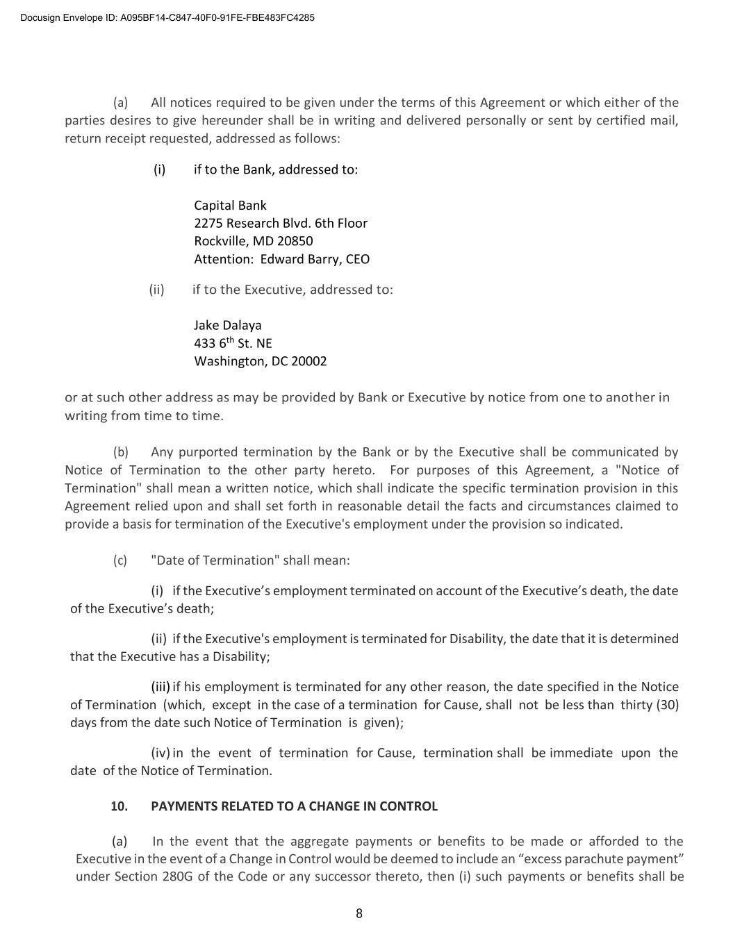 8 (a) All notices required to be given under the terms of this Agreement or which either of the parties desires to give hereunder shall be in writing and delivered personally or sent by certified mail, return receipt requested, addressed as follows: (i) if to the Bank, addressed to: Capital Bank 2275 Research Blvd. 6th Floor Rockville, MD 20850 Attention: Edward Barry, CEO (ii) if to the Executive, addressed to: Jake Dalaya 433 6th St. NE Washington, DC 20002 or at such other address as may be provided by Bank or Executive by notice from one to another in writing from time to time. (b) Any purported termination by the Bank or by the Executive shall be communicated by Notice of Termination to the other party hereto. For purposes of this Agreement, a "Notice of Termination" shall mean a written notice, which shall indicate the specific termination provision in this Agreement relied upon and shall set forth in reasonable detail the facts and circumstances claimed to provide a basis for termination of the Executive's employment under the provision so indicated. (c) "Date of Termination" shall mean: (i) if the Executive’s employment terminated on account of the Executive’s death, the date of the Executive’s death; (ii) if the Executive's employment is terminated for Disability, the date that it is determined that the Executive has a Disability; (iii) if his employment is terminated for any other reason, the date specified in the Notice of Termination (which, except in the case of a termination for Cause, shall not be less than thirty (30) days from the date such Notice of Termination is given); (iv) in the event of termination for Cause, termination shall be immediate upon the date of the Notice of Termination. 10. PAYMENTS RELATED TO A CHANGE IN CONTROL (a) In the event that the aggregate payments or benefits to be made or afforded to the Executive in the event of a Change in Control would be deemed to include an “excess parachute payment” under Section 280G of the Code or any successor thereto, then (i) such payments or benefits shall be Docusign Envelope ID: A095BF14-C847-40F0-91FE-FBE483FC4285