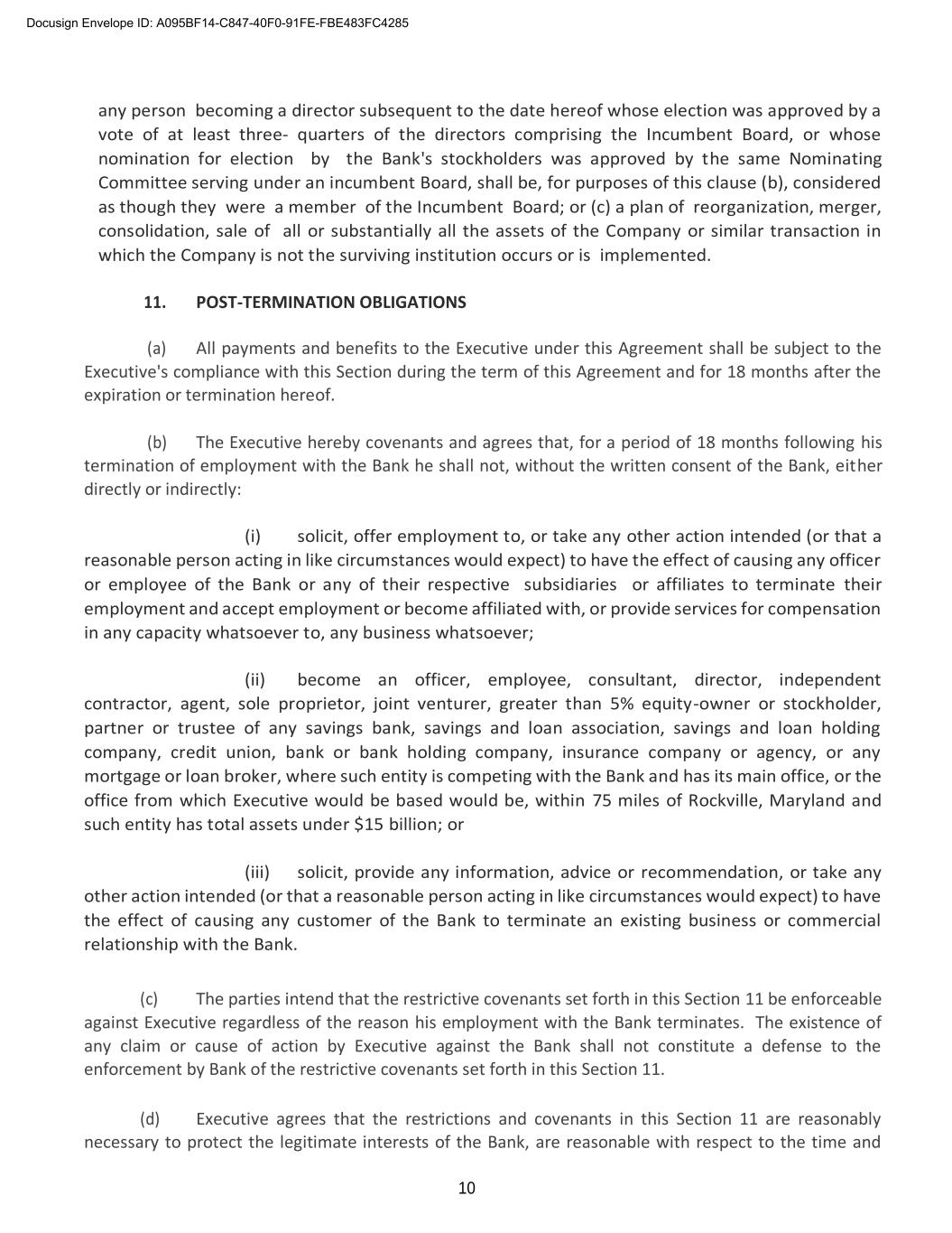 10 any person becoming a director subsequent to the date hereof whose election was approved by a vote of at least three quarters of the directors comprising the Incumbent Board, or whose nomination for election by the Bank's stockholders was approved by the same Nominating Committee serving under an incumbent Board, shall be, for purposes of this clause (b), considered as though they were a member of the Incumbent Board; or (c) a plan of reorganization, merger, consolidation, sale of all or substantially all the assets of the Company or similar transaction in which the Company is not the surviving institution occurs or is implemented. 11. POST-TERMINATION OBLIGATIONS (a) All payments and benefits to the Executive under this Agreement shall be subject to the Executive's compliance with this Section during the term of this Agreement and for 18 months after the expiration or termination hereof. (b) The Executive hereby covenants and agrees that, for a period of 18 months following his termination of employment with the Bank he shall not, without the written consent of the Bank, either directly or indirectly: (i) solicit, offer employment to, or take any other action intended (or that a reasonable person acting in like circumstances would expect) to have the effect of causing any officer or employee of the Bank or any of their respective subsidiaries or affiliates to terminate their employment and accept employment or become affiliated with, or provide services for compensation in any capacity whatsoever to, any business whatsoever; (ii) become an officer, employee, consultant, director, independent contractor, agent, sole proprietor, joint venturer, greater than 5% equity-owner or stockholder, partner or trustee of any savings bank, savings and loan association, savings and loan holding company, credit union, bank or bank holding company, insurance company or agency, or any mortgage or loan broker, where such entity is competing with the Bank and has its main office, or the office from which Executive would be based would be, within 75 miles of Rockville, Maryland and such entity has total assets under $15 billion; or (iii) solicit, provide any information, advice or recommendation, or take any other action intended (or that a reasonable person acting in like circumstances would expect) to have the effect of causing any customer of the Bank to terminate an existing business or commercial relationship with the Bank. (c) The parties intend that the restrictive covenants set forth in this Section 11 be enforceable against Executive regardless of the reason his employment with the Bank terminates. The existence of any claim or cause of action by Executive against the Bank shall not constitute a defense to the enforcement by Bank of the restrictive covenants set forth in this Section 11. (d) Executive agrees that the restrictions and covenants in this Section 11 are reasonably necessary to protect the legitimate interests of the Bank, are reasonable with respect to the time and Docusign Envelope ID: A095BF14-C847-40F0-91FE-FBE483FC4285
