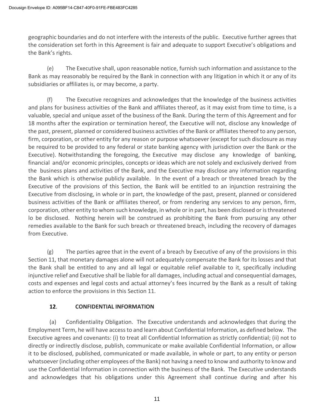 11 geographic boundaries and do not interfere with the interests of the public. Executive further agrees that the consideration set forth in this Agreement is fair and adequate to support Executive’s obligations and the Bank’s rights. (e) The Executive shall, upon reasonable notice, furnish such information and assistance to the Bank as may reasonably be required by the Bank in connection with any litigation in which it or any of its subsidiaries or affiliates is, or may become, a party. (f) The Executive recognizes and acknowledges that the knowledge of the business activities and plans for business activities of the Bank and affiliates thereof, as it may exist from time to time, is a valuable, special and unique asset of the business of the Bank. During the term of this Agreement and for 18 months after the expiration or termination hereof, the Executive will not, disclose any knowledge of the past, present, planned or considered business activities of the Bank or affiliates thereof to any person, firm, corporation, or other entity for any reason or purpose whatsoever (except for such disclosure as may be required to be provided to any federal or state banking agency with jurisdiction over the Bank or the Executive). Notwithstanding the foregoing, the Executive may disclose any knowledge of banking, financial and/or economic principles, concepts or ideas which are not solely and exclusively derived from the business plans and activities of the Bank, and the Executive may disclose any information regarding the Bank which is otherwise publicly available. ln the event of a breach or threatened breach by the Executive of the provisions of this Section, the Bank will be entitled to an injunction restraining the Executive from disclosing, in whole or in part, the knowledge of the past, present, planned or considered business activities of the Bank or affiliates thereof, or from rendering any services to any person, firm, corporation, other entity to whom such knowledge, in whole or in part, has been disclosed or is threatened lo be disclosed. Nothing herein will be construed as prohibiting the Bank from pursuing any other remedies available to the Bank for such breach or threatened breach, including the recovery of damages from Executive. (g) The parties agree that in the event of a breach by Executive of any of the provisions in this Section 11, that monetary damages alone will not adequately compensate the Bank for its losses and that the Bank shall be entitled to any and all legal or equitable relief available to it, specifically including injunctive relief and Executive shall be liable for all damages, including actual and consequential damages, costs and expenses and legal costs and actual attorney’s fees incurred by the Bank as a result of taking action to enforce the provisions in this Section 11. 12. CONFIDENTIAL INFORMATION (a) Confidentiality Obligation. The Executive understands and acknowledges that during the Employment Term, he will have access to and learn about Confidential Information, as defined below. The Executive agrees and covenants: (i) to treat all Confidential Information as strictly confidential; (ii) not to directly or indirectly disclose, publish, communicate or make available Confidential Information, or allow it to be disclosed, published, communicated or made available, in whole or part, to any entity or person whatsoever (including other employees of the Bank) not having a need to know and authority to know and use the Confidential Information in connection with the business of the Bank. The Executive understands and acknowledges that his obligations under this Agreement shall continue during and after his Docusign Envelope ID: A095BF14-C847-40F0-91FE-FBE483FC4285