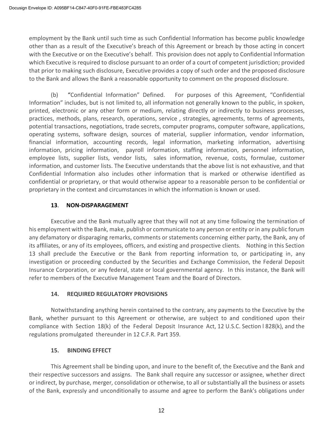 12 employment by the Bank until such time as such Confidential Information has become public knowledge other than as a result of the Executive’s breach of this Agreement or breach by those acting in concert with the Executive or on the Executive’s behalf. This provision does not apply to Confidential Information which Executive is required to disclose pursuant to an order of a court of competent jurisdiction; provided that prior to making such disclosure, Executive provides a copy of such order and the proposed disclosure to the Bank and allows the Bank a reasonable opportunity to comment on the proposed disclosure. (b) “Confidential Information” Defined. For purposes of this Agreement, “Confidential Information” includes, but is not limited to, all information not generally known to the public, in spoken, printed, electronic or any other form or medium, relating directly or indirectly to business processes, practices, methods, plans, research, operations, service , strategies, agreements, terms of agreements, potential transactions, negotiations, trade secrets, computer programs, computer software, applications, operating systems, software design, sources of material, supplier information, vendor information, financial information, accounting records, legal information, marketing information, advertising information, pricing information, payroll information, staffing information, personnel information, employee lists, supplier lists, vendor lists, sales information, revenue, costs, formulae, customer information, and customer lists. The Executive understands that the above list is not exhaustive, and that Confidential Information also includes other information that is marked or otherwise identified as confidential or proprietary, or that would otherwise appear to a reasonable person to be confidential or proprietary in the context and circumstances in which the information is known or used. 13. NON-DISPARAGEMENT Executive and the Bank mutually agree that they will not at any time following the termination of his employment with the Bank, make, publish or communicate to any person or entity or in any public forum any defamatory or disparaging remarks, comments or statements concerning either party, the Bank, any of its affiliates, or any of its employees, officers, and existing and prospective clients. Nothing in this Section 13 shall preclude the Executive or the Bank from reporting information to, or participating in, any investigation or proceeding conducted by the Securities and Exchange Commission, the Federal Deposit Insurance Corporation, or any federal, state or local governmental agency. In this instance, the Bank will refer to members of the Executive Management Team and the Board of Directors. 14. REQUIRED REGULATORY PROVISIONS Notwithstanding anything herein contained to the contrary, any payments to the Executive by the Bank, whether pursuant to this Agreement or otherwise, are subject to and conditioned upon their compliance with Section 18(k) of the Federal Deposit Insurance Act, 12 U.S.C. Section l 828(k), and the regulations promulgated thereunder in 12 C.F.R. Part 359. 15. BINDING EFFECT This Agreement shall be binding upon, and inure to the benefit of, the Executive and the Bank and their respective successors and assigns. The Bank shall require any successor or assignee, whether direct or indirect, by purchase, merger, consolidation or otherwise, to all or substantially all the business or assets of the Bank, expressly and unconditionally to assume and agree to perform the Bank's obligations under Docusign Envelope ID: A095BF14-C847-40F0-91FE-FBE483FC4285