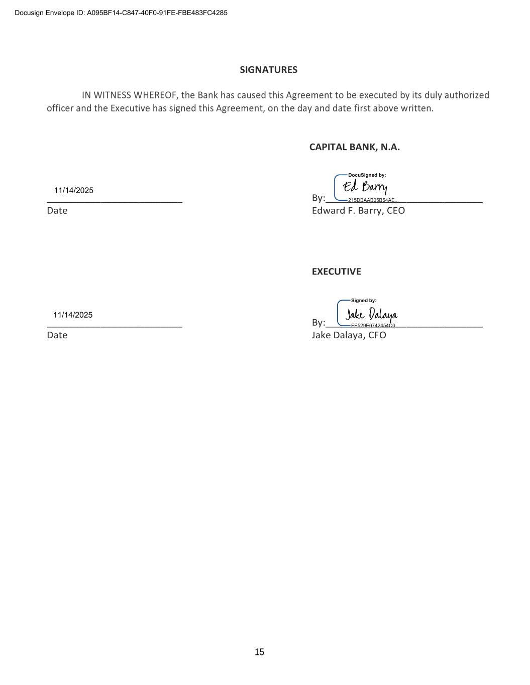 15 SIGNATURES IN WITNESS WHEREOF, the Bank has caused this Agreement to be executed by its duly authorized officer and the Executive has signed this Agreement, on the day and date first above written. CAPITAL BANK, N.A. _________________________ By:_____________________________ Date Edward F. Barry, CEO EXECUTIVE _________________________ By:_____________________________ Date Jake Dalaya, CFO Docusign Envelope ID: A095BF14-C847-40F0-91FE-FBE483FC4285 11/14/2025 11/14/2025
