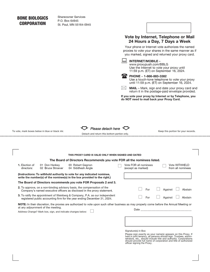 The proxy statement, proxy card and 2023 Annual Report to stockholders for the fiscal year ended December 31, 2023 are available at the following website: www.bonebiologics.com/investor-relation. These documents are also available to any stockholder who wishes to receive a paper copy by calling 866-870-3684, visiting www.investorelections.com/BBLG or emailing paper@investorelections.com.