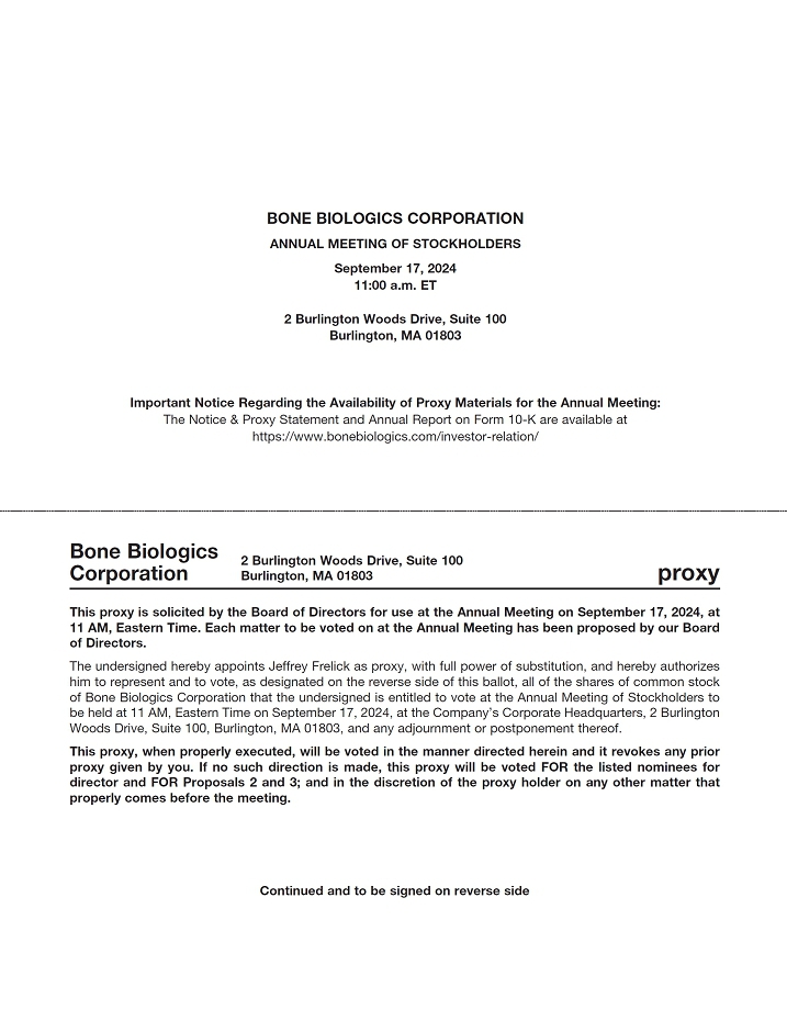 You are cordially invited to attend the 2024 Annual Meeting of Stockholders of Bone Biologics Corporation for the fiscal year ended December 31, 2023 (the “Annual Meeting”), to be held at 11:00 a.m. Eastern Time on Tuesday, September 17, 2024 at Bone Biologics Corporation offices, 2 Burlington Woods Drive, Ste 100, Burlington, MA 01803. Stockholders may also listen to the Annual Meeting via telephone at 520-525-8845. Directions to our corporate headquarters are available at www.bonebiologics.com.