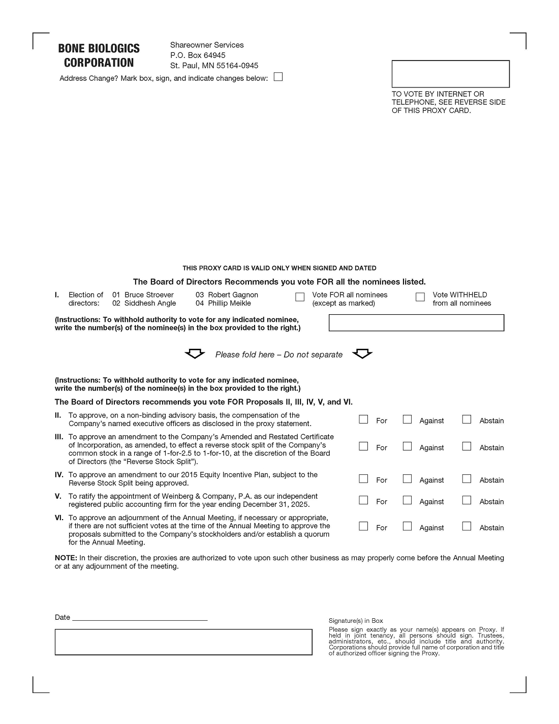 Stockholders of the Company as of April 17, 2025, the Record Date, may vote in one of the following four ways: (1) by Internet at www.proxypush.com/BBLG, we encourage you to vote this way, (2) by touch tone telephone: call toll-free at 1-866-883-3382, (3) by completing, signing, dating and returning your proxy card, and (4) at the Annual Meeting. It is important that you vote your shares whether or not you attend the Annual Meeting in person. If you attend the Annual Meeting, you may vote in person even if you have previously returned your proxy card or completed your proxy on the Internet. Only the latest vote you submit will be counted. Shares represented by proxy will be voted in accordance with the instructions you provide to the individuals named on the proxy. If you provide no instruction, the shares will be voted for all of the proposals.