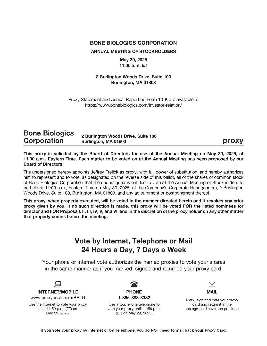 This proxy statement is being furnished to the stockholders of Bone Biologics Corporation, a Delaware corporation (the “Company”), in connection with the solicitation of proxies by the Company’s Board of Directors (the “Board”) for use at the Annual Meeting to be held at 11:00 a.m. Eastern Time on Friday, May 30, 2025, at Bone Biologics Corporation offices, 2 Burlington Woods Drive, Ste 100, Burlington, MA 01803, and at any adjournments or postponements thereof. Directions to our corporate headquarters are available at www.bonebiologics.com.