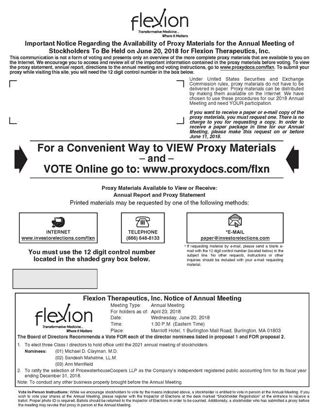 Important Notice Regarding the Availability of Proxy Materials for the Annual Meeting of Stockholders To Be Held on June 20, 2018 for Flexion Therapeutics, Inc. This communication is not a form of voting and presents only an overview of the more complete proxy materials that are available to you on the Internet. We encourage you to access and review all of the important information contained in the proxy materials before voting. To view the proxy statement, annual report, directions to the annual meeting and voting instructions, go to www.proxydocs.com/flxn. To submit your proxy while visiting this site, you will need the 12 digit control number in the box below. Under United States Securities and Exchange Commission rules, proxy materials do not have to be delivered in paper. Proxy materials can be distributed by making them available on the Internet. We have chosen to use these procedures for our 2018 Annual Meeting and need YOUR participation. If you want to receive a paper or e-mail copy of the proxy materials, you must request one. There is no charge to you for requesting a copy. In order to receive a paper package in time for our Annual Meeting, please make this request on or before June 11, 2018. For a Convenient Way to VIEW Proxy Materials – and – VOTE Online go to: www.proxydocs.com/flxn Proxy Materials Available to View or Receive: Annual Report and Proxy Statement Printed materials may be requested by one of the following methods: INTERNET www.investorelections.com/flxn TELEPHONE (866) 648-8133 *E-MAIL paper@investorelections.com * If requesting material by e-mail, please send a blank e- You must use the 12 digit control number located in the shaded gray box below. mail with the 12 digit control number (located below) in the subject line. No other requests, instructions or other inquiries should be included with your e-mail requesting material. Flexion Therapeutics, Inc. Notice of Annual Meeting Meeting Type: Annual Meeting For holders as of: April 23, 2018 Date: Wednesday, June 20, 2018 Time: 1:30 P.M. (Eastern Time) Place: Marriott Hotel, 1 Burlington Mall Road, Burlington, MA 01803 The Board of Directors Recommends a Vote FOR each of the director nominees listed in proposal 1 and FOR proposal 2. 1. To elect three Class I directors to hold office until the 2021 annual meeting of stockholders. Nominees: (01) Michael D. Clayman, M.D. (02) Sandesh Mahatme, LL.M. (03) Ann Merrifield 2. To ratify the selection of PricewaterhouseCoopers LLP as the Company’s independent registered public accounting firm for its fiscal year ending December 31, 2018. Note: To conduct any other business properly brought before the Annual Meeting. Vote In-Person Instructions: While we encourage stockholders to vote by the means indicated above, a stockholder is entitled to vote in person at the Annual Meeting. If you wish to vote your shares at the Annual Meeting, please register with the Inspector of Elections at the desk marked “Stockholder Registration” at the entrance to receive a ballot. Proper photo ID is required. Ballots should be returned to the Inspector of Elections in order to be counted. Additionally, a stockholder who has submitted a proxy before the meeting may revoke that proxy in person at the Annual Meeting.
