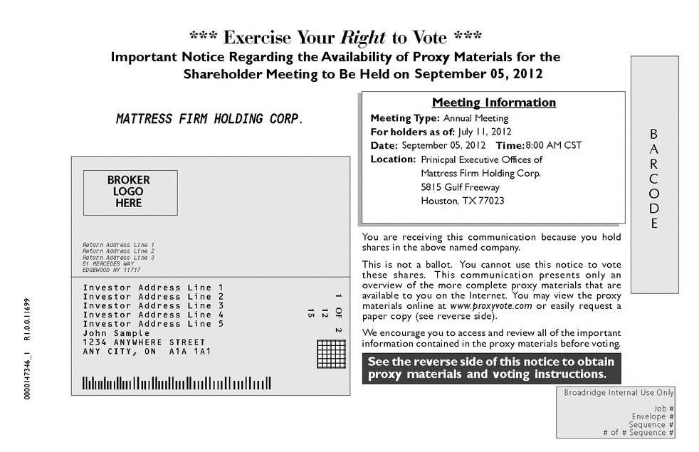 BARCODE See the reverse side of this notice to obtain proxy materials and voting instructions. BROKER LOGO HERE 1 OF 2 12 15 1234567 1234567 1234567 1234567 1234567 1234567 1234567 Broadridge Internal Use Only Job # Envelope # Sequence # # of # Sequence # *** Exercise Your Right to Vote *** Important Notice Regarding the Availability of Proxy Materials for the Shareholder Meeting to Be Held on <mtgdate>. You are receiving this communication because you hold shares in the above named company. This is not a ballot. You cannot use this notice to vote these shares. This communication presents only an overview of the more complete proxy materials that are available to you on the Internet. You may view the proxy materials online at www.proxyvote.com or easily request a paper copy (see reverse side). We encourage you to access and review all of the important information contained in the proxy materials before voting. Meeting Information Meeting Type: <mtgtype> For holders as of: <recdate> Date: Time: <mtgtime> Location: 0000147346_1 R1.0.0.11699 MATTRESS FIRM HOLDING CORP. Annual Meeting September 05, 2012 September 05, 2012 8:00 AM CST July 11, 2012 Prinicpal Executive Offices of Mattress Firm Holding Corp. 5815 Gulf Freeway Houston, TX 77023 Return Address Line 1 Return Address Line 2 Return Address Line 3 51 MERCEDES WAY EDGEWOOD NY 11717 Investor Address Line 1 Investor Address Line 2 Investor Address Line 3 Investor Address Line 4 Investor Address Line 5 John Sample 1234 ANYWHERE STREET ANY CITY, ON A1A 1A1 |