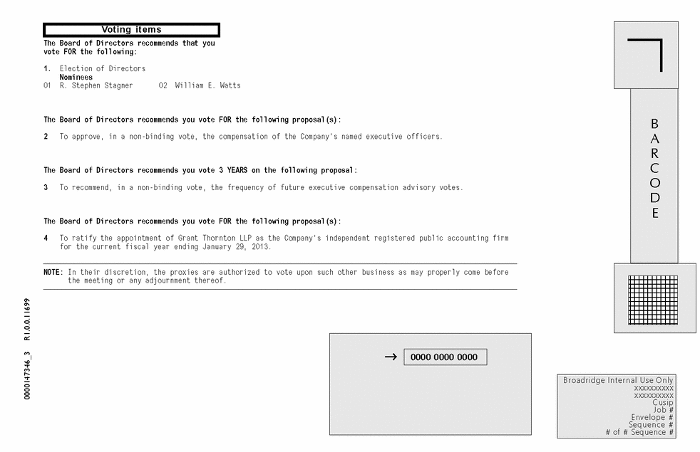 BARCODE 123456789012 123456789012 123456789012 123456789012 123456789012 123456789012 123456789012 123456789012 123456789012 123456789012 123456789012 123456789012 Broadridge Internal Use Only xxxxxxxxxx xxxxxxxxxx Cusip Job # Envelope # Sequence # # of # Sequence # 0000 0000 0000. Voting items 0000147346_3 R1.0.0.11699 The Board of Directors recommends that you vote FOR the following: 1. Election of Directors Nominees 01 R. Stephen Stagner 02 William E. Watts The Board of Directors recommends you vote FOR the following proposal(s): 2 To approve, in a non-binding vote, the compensation of the Company's named executive officers. The Board of Directors recommends you vote 3 YEARS on the following proposal: 3 To recommend, in a non-binding vote, the frequency of future executive compensation advisory votes. The Board of Directors recommends you vote FOR the following proposal(s): 4 To ratify the appointment of Grant Thornton LLP as the Company's independent registered public accounting firm for the current fiscal year ending January 29, 2013. NOTE: In their discretion, the proxies are authorized to vote upon such other business as may properly come before the meeting or any adjournment thereof. |