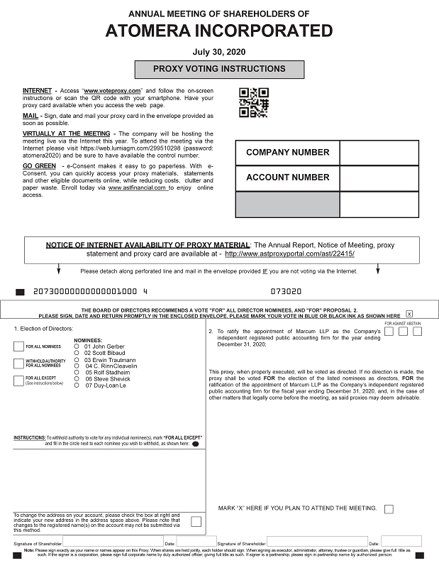 2 . To ratify the appointment of Marcum LLP as the Company's independent registered public accounting firm for the year ending December 31 , 2020 ; This proxy, when properly executed, will be voted as directed . If no direction is made, the proxy shall be voted FOR the election of the listed nominees as directors, FOR the ratification of the appointment of Marcum LLP as the Company’s independent registered public accounting firm for the fiscal year ending December 31 , 2020 , and, in the case of other matters that legally come before the meeting, as said proxies may deem advisable . Signature of Shareholder Date: Note: Please sign exactly as your name or names appear on this Proxy. When shares are held jointly, each holder should sign. When signing as executor, administrator, attorney, trustee or guardian, please give full title as such. If the signer is a corporation, please sign full corporate name by duly authorized officer, giving full title as such. If signer is a partnership, please sign in partnership name by authorized person. To change the address on your account, please check the box at right and indicate your new address in the address space above . Please note that changes to the registered name(s) on the account may not be submitted via this method . Signature of Shareholder Date : INSTRUCTIONS: To withhold authority to vote for any individual nominee(s), mark “FOR ALL EXCEPT” and fill in the circle next to each nominee you wish to withhold, as shown here: PROXY VOTING INSTRUCTIONS x Please detach along perforated line and mail in the envelope provided IF you are not voting via the Internet. 20730000000000001000 4 073020 THE BOARD OF DIRECTORS RECOMMENDS A VOTE "FOR" ALL DIRECTOR NOMINEES, AND "FOR" PROPOSAL 2. PLEASE SIGN, DATE AND RETURN PROMPTLY IN THE ENCLOSED ENVELOPE. PLEASE MARK YOUR VOTE IN BLUE OR BLACK INK AS SHOWN HERE COMPANY NUMBER ACCOUNT NUMBER NOTICE OF INTERNET AVAILABILITY OF PROXY MATERIAL : The Annual Report, Notice of Meeting, proxy statement and proxy card are available at - http://www.astproxyportal.com/ast/22415/ MARK “X” HERE IF YOU PLAN TO ATTEND THE MEETING. ANNUAL MEETING OF SHAREHOLDERS OF ATOMERA INCORPORATED July 30, 2020 1. Election of Directors: O 04 C. Rinn Cleavelin O 05 Rolf Stadheim O 06 Steve Shevick O 07 Duy - Loan Le WITHHOLD AUTHORITY FOR ALL NOMINEES FOR ALL EXCEPT (See instructions below) NOMINEES: FOR ALL NOMINEES O 01 John Gerber O 02 Scott Bibaud O 03 Erwin Trautmann FOR AGAINST ABSTAIN INTERNET - Access “ www . voteproxy . com ” and follow the on - screen instructions or scan the QR code with your smartphone . Have your proxy card available when you access the web page . MAIL - Sign, date and mail your proxy card in the envelope provided as soon as possible . VIRTUALLY AT THE MEETING - The company will be hosting the meeting live via the Internet this year . To attend the meeting via the Internet please visit https : //web . lumiagm . com/ 299510298 (password : atomera 2020 ) and be sure to have available the control number . GO GREEN - e - Consent makes it easy to go paperless . With e - Consent, you can quickly access your proxy materials, statements and other eligible documents online, while reducing costs, clutter and paper waste . Enroll today via www . astfinancial . com to enjoy online access .