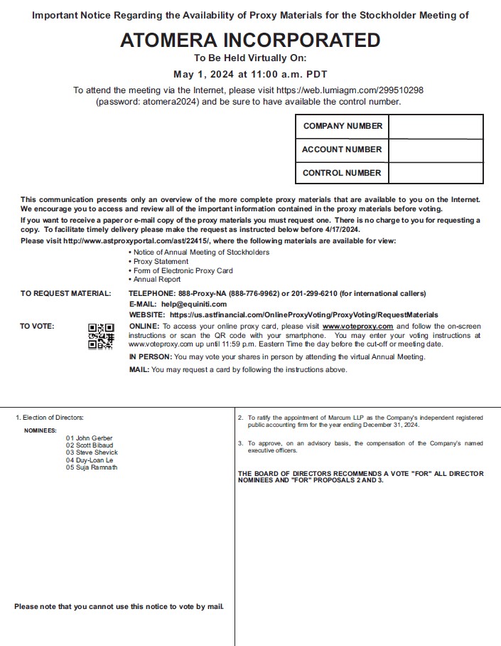 2. To ratify the appointment of Marcum LLP as the Company's independent registered public accounting firm for the year ending December 31, 2024. 3. To approve, on an advisory basis, the compensation of the Company’s named executive officers. THE BOARD OF DIRECTORS RECOMMENDS A VOTE "FOR" ALL DIRECTOR NOMINEES AND "FOR" PROPOSALS 2 AND 3. 1. Election of Directors: NOMINEES: 1. John Gerber 2. Scott Bibaud 3. Steve Shevick 4. Duy - Loan Le 5. Suja Ramnath This communication presents only an overview of the more complete proxy materials that are available to you on the Internet. We encourage you to access and review all of the important information contained in the proxy materials before voting. If you want to receive a paper or e - mail copy of the proxy materials you must request one. There is no charge to you for requesting a copy. To facilitate timely delivery please make the request as instructed below before 4/17/2024. Please visit http://www.astproxyportal.com/ast/22415/, where the following materials are available for view: • Notice of Annual Meeting of Stockholders • Proxy Statement • Form of Electronic Proxy Card • Annual Report TO REQUEST MATERIAL: TELEPHONE: 888 - Proxy - NA (888 - 776 - 9962) or 201 - 299 - 6210 (for international callers) E - MAIL: help@equiniti.com WEBSITE: https://us.astfinancial.com/OnlineProxyVoting/ProxyVoting/RequestMaterials ONLINE : To access your online proxy card, please visit www . voteproxy . com and follow the on - screen instructions or scan the QR code with your smartphone . You may enter your voting instructions at www . voteproxy . com up until 11 : 59 p . m . Eastern Time the day before the cut - off or meeting date . IN PERSON : You may vote your shares in person by attending the virtual Annual Meeting . MAIL : You may request a card by following the instructions above . TO VOTE: COMPANY NUMBER ACCOUNT NUMBER CONTROL NUMBER Please note that you cannot use this notice to vote by mail. Important Notice Regarding the Availability of Proxy Materials for the Stockholder Meeting of ATOMERA INCORPORATED To Be Held Virtually On: May 1, 2024 at 11:00 a.m. PDT To attend the meeting via the Internet, please visit https://web.lumiagm.com/299510298 (password: atomera2024) and be sure to have available the control number.