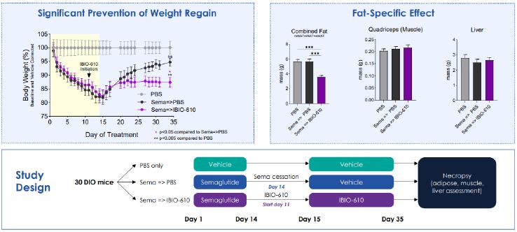 IBIO-610 was also tested as a maintenance therapy following cessation of semaglutide treatment. In this model, DIO mice were first dosed with semaglutide for two weeks, leading to approximately 18% weight loss. Upon stopping semaglutide, control mice regained 71% of the lost weight within three weeks, with fat mass levels returning to those of untreated animals. In contrast, mice receiving IBIO-610 at the time of semaglutide discontinuation regained only 28% of the lost weight and retained significantly lower fat mass at study termination, highlighting the potential of IBIO-610 to prevent rebound weight gain.