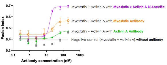 Building on these insights, we initiated a program to develop a bispecific antibody targeting both myostatin and Activin A. Leveraging our StableHu™ platform and mammalian display, this program is in late discovery, where multiple parameters, such as binding affinity, expression levels, and stability, are being optimized. Early in vitro findings in human muscle progenitor cells suggest that the bispecific candidate induces a stronger differentiation of progenitor cells into mature muscle cells compared to antibodies targeting only myostatin or Activin A alone. Increased muscle fusion index in human muscle stem cells, as shown in the chart below, is a surrogate of muscle growth.